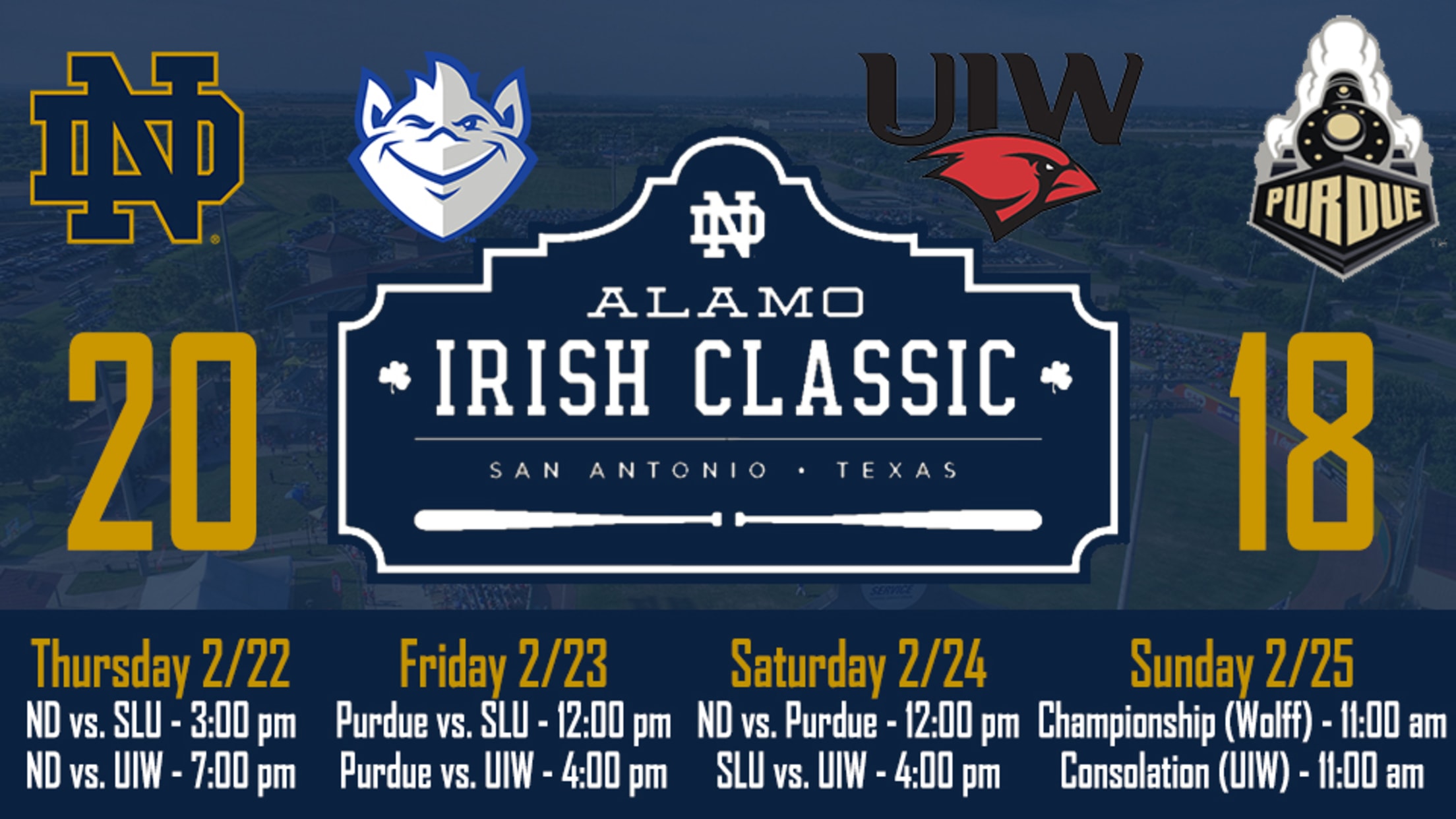 San Antonio - The 2018 Alamo Irish Classic, courtesy of the Notre Dame Club of San Antonio, will begin Thursday, February 22 at Wolff Stadium.This year's Classic will kick off Thursday at 3 PM (CST) with a matchup between the University of Notre Dame and Saint Louis University. The University