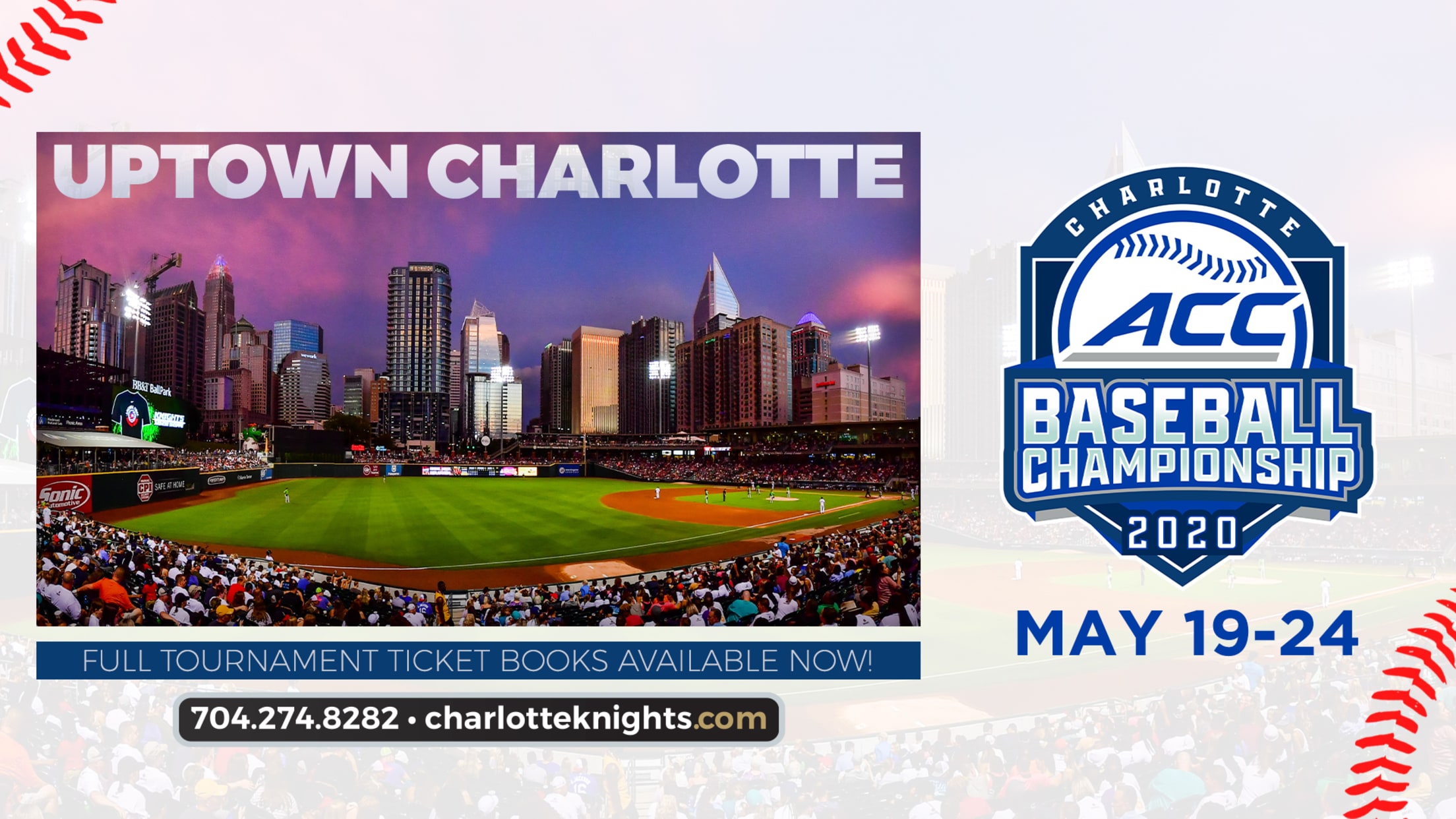 GREENSBORO, N.C. (theACC.com) - Full tournament packages for the 2020 Atlantic Coast Conference Baseball Championship, scheduled for May 19-24 at BB&T Ballpark in Charlotte, North Carolina, are now on sale. Ticket books for the full tournament are available for $225 on the club level and $170 for field box seats,