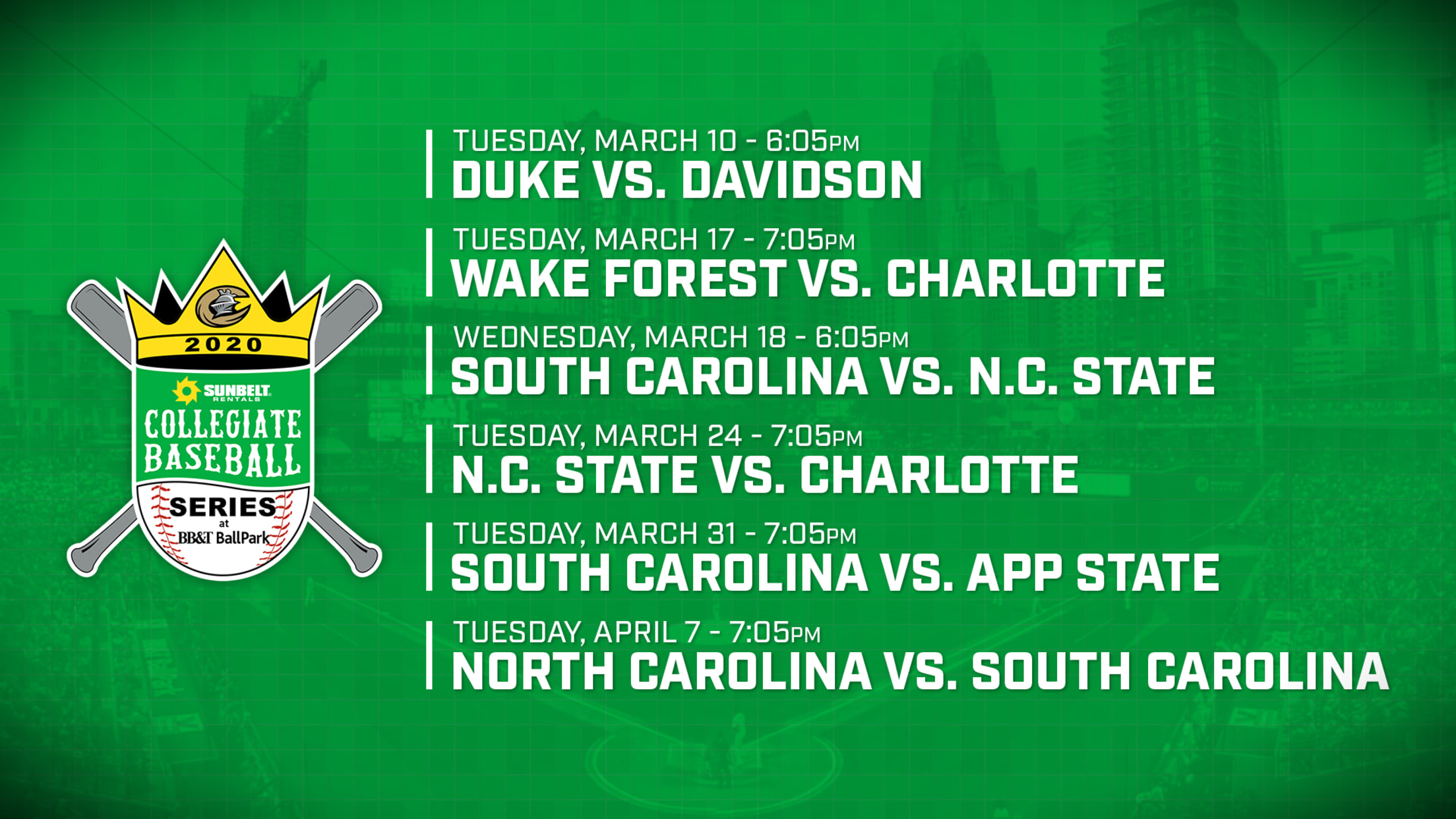 In all, the 2020 Sunbelt Rentals Collegiate Baseball Series will feature a total of six games. The Charlotte 49ers, who played the first-ever collegiate baseball game in BB&T Ballpark history (2015), will return to host two games this year (Tuesday, March 17 and Tuesday, March 24). Additionally, the 2020 Sunbelt Rentals Collegiate Baseball Series features the return of Appalachian State University, North Carolina State University, Wake Forest University, Davidson College, and Duke University to BB&T Ballpark.