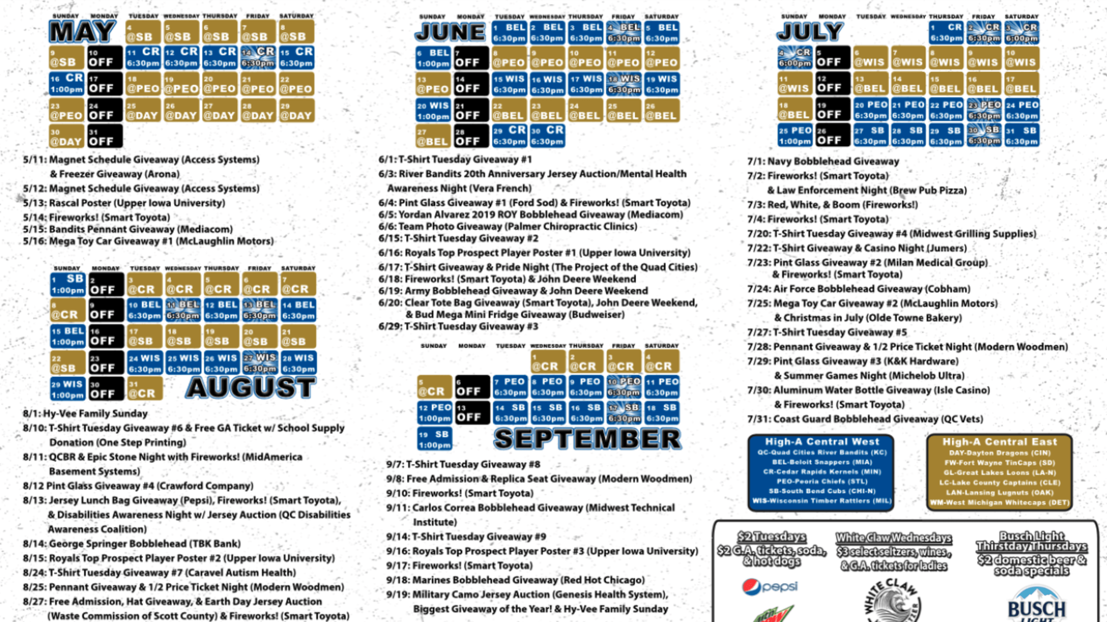 Among several returning fan-favorites including two mega toy car giveaways, three pennant giveaways, and four pint glass giveaways, the Bandits will feature 13 fireworks shows throughout the season—the most in River Bandits history—including three straight on July 2, July 3, and July 4.