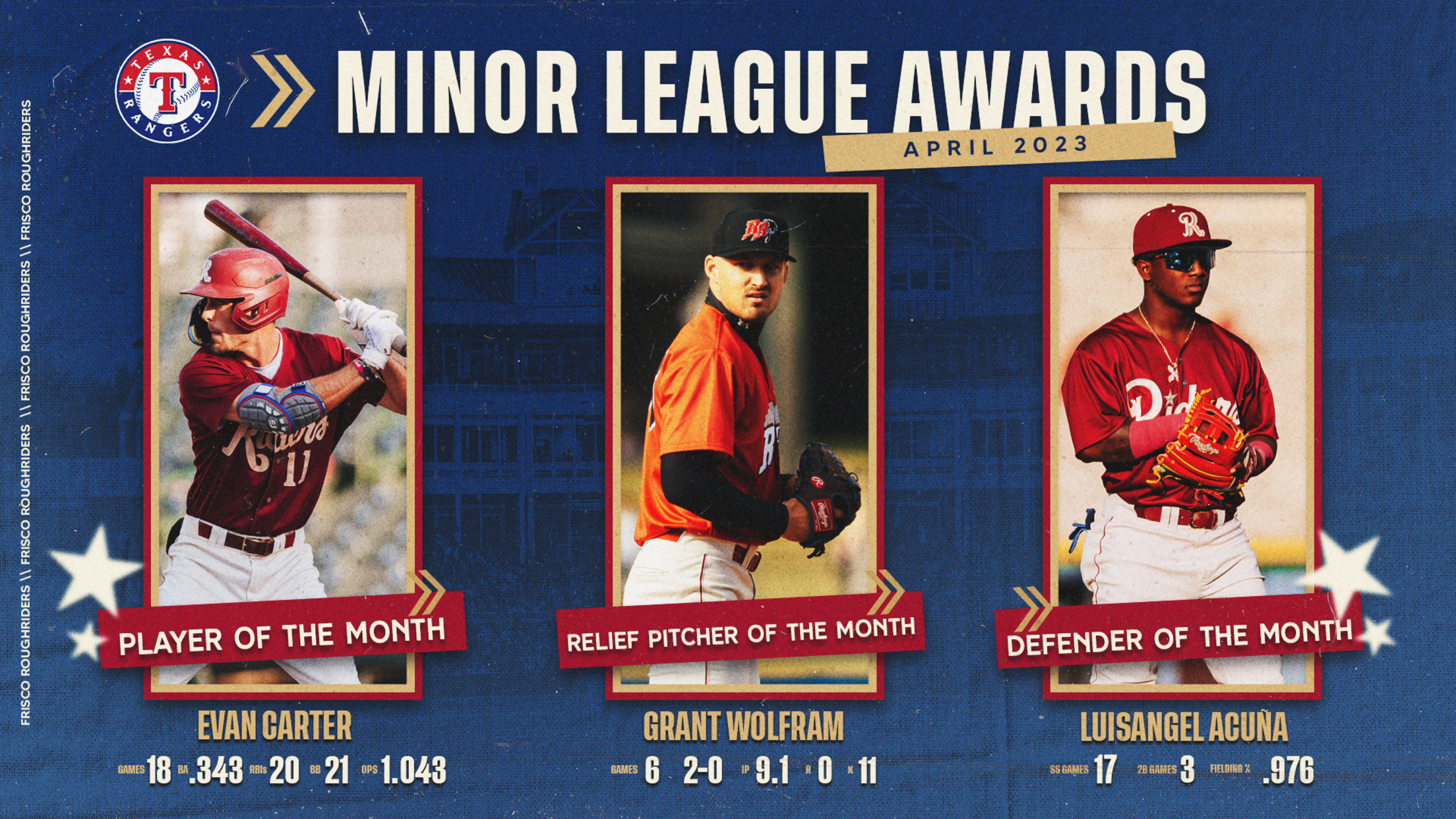 FRISCO, Texas (May 8, 2023) - The Texas Rangers announced on Monday that three RoughRiders players won April honors for the Rangers Minor League system. Evan Carter captured Player of the Month honors while Grant Wolfram was named the Relief Pitcher of the Month and Luisangel Acuña the Defender of the Month.