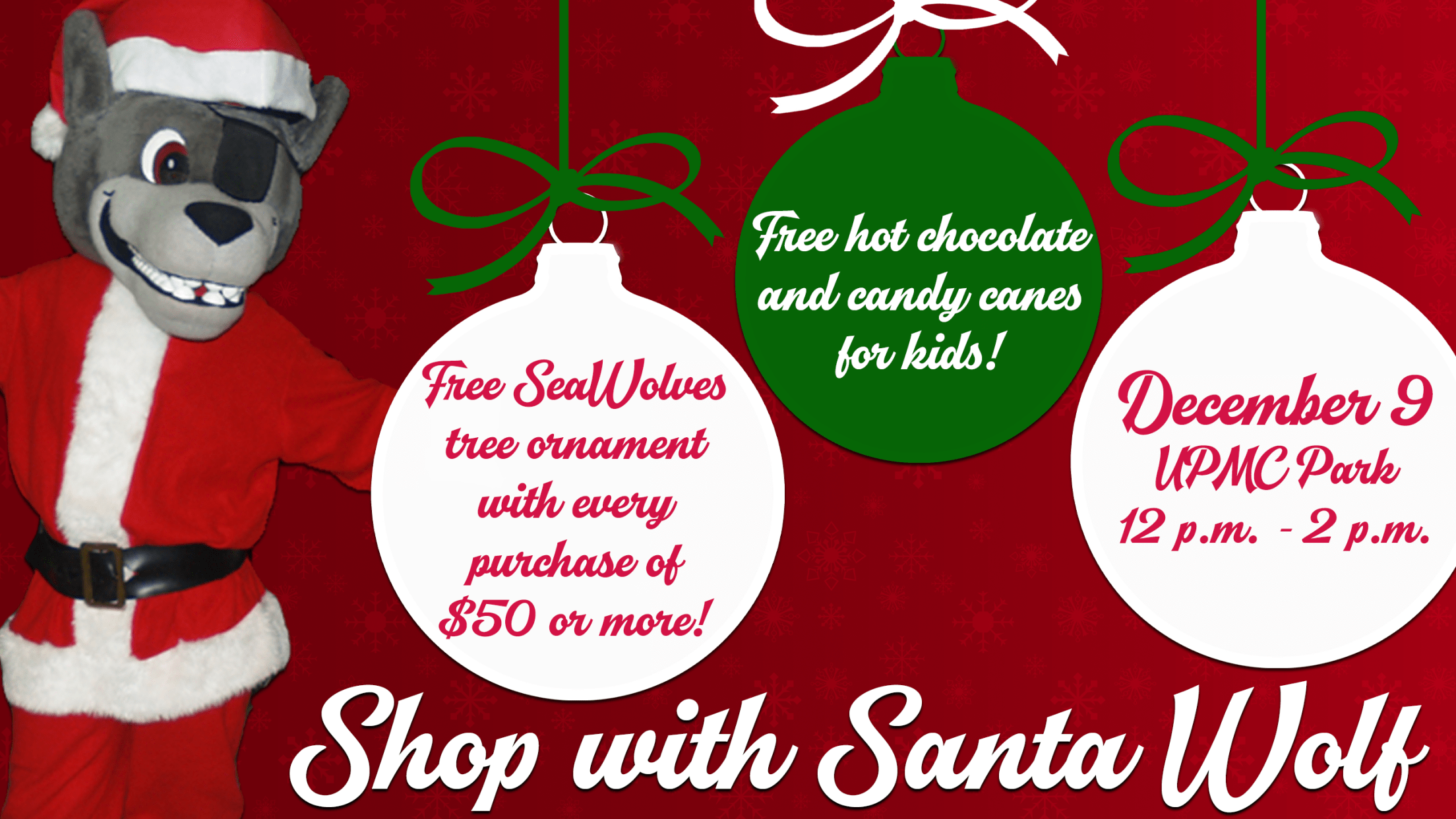 All kids will be treated to a free candy cane and hot chocolate. Customers who spend $50 or more will receive a free SeaWolves Christmas tree ornament, while supplies last.