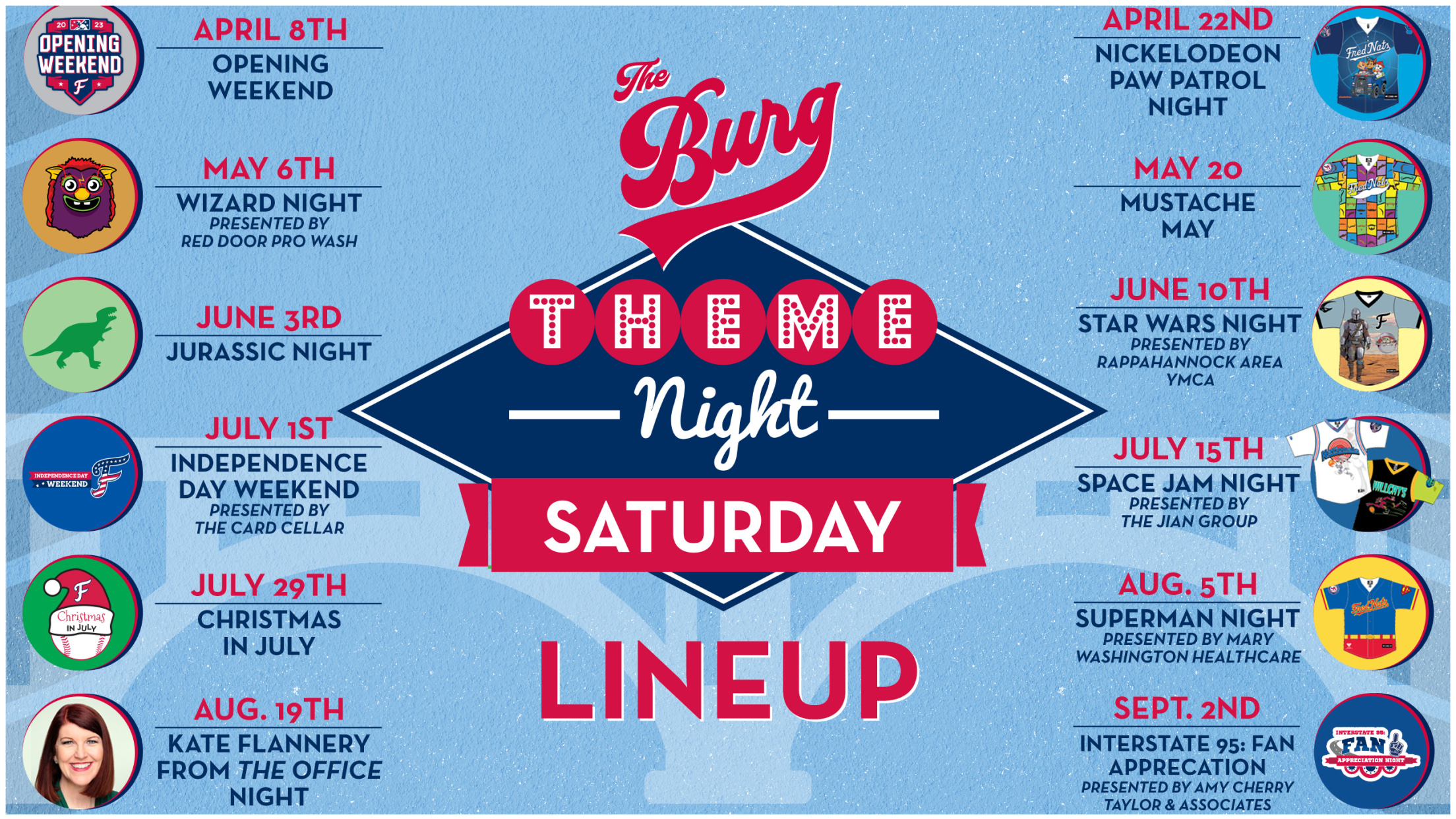 FREDERICKSBURG, VA – Captivating theme nights are set to take over Virginia Credit Union Stadium every Saturday night, making for twelve unique fan experiences. Saturday nights will also be the home to six jersey auctions plus appearances from a celebrity and some popular kids characters.