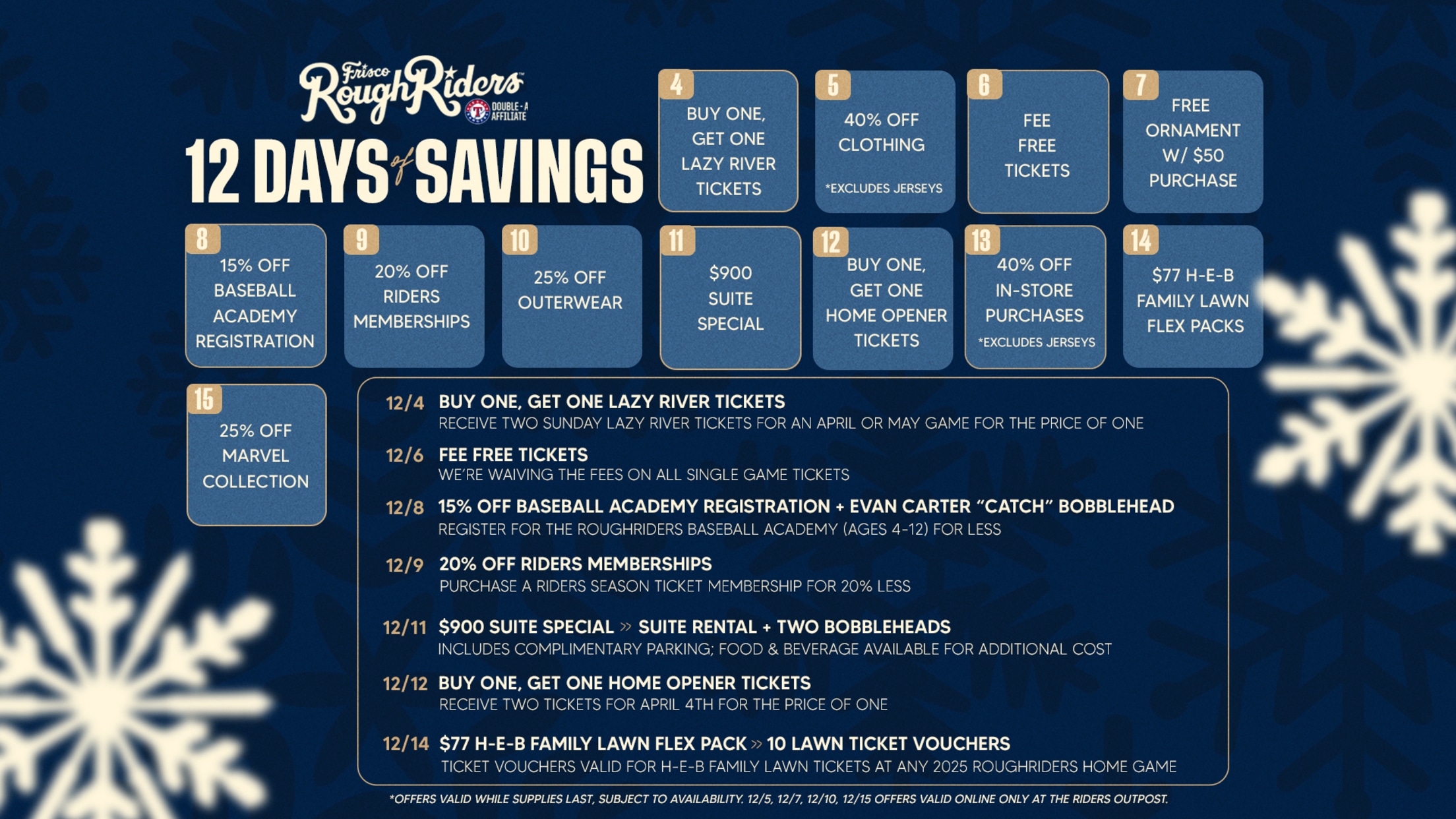 FRISCO, Texas (December 2, 2024) – The Frisco RoughRiders are excited to let their fans in on some festive deals for this holiday season with their 12 Days of Savings! Starting December 4th and going through December 15th, there will be a special 24-hour-only deal. Click on the links below