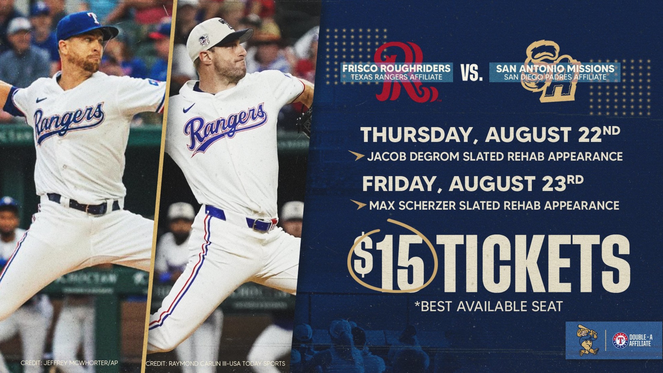 FRISCO, Texas (August 20, 2024) – Texas Rangers starting pitcher Jacob deGrom is expected to rehab with the Frisco RoughRiders on Thursday, August 22nd at 7:05 p.m. before Max Scherzer takes the hill at 7:05 p.m. on Friday when the RoughRiders meet the San Antonio Missions (San Diego Padres affiliate)