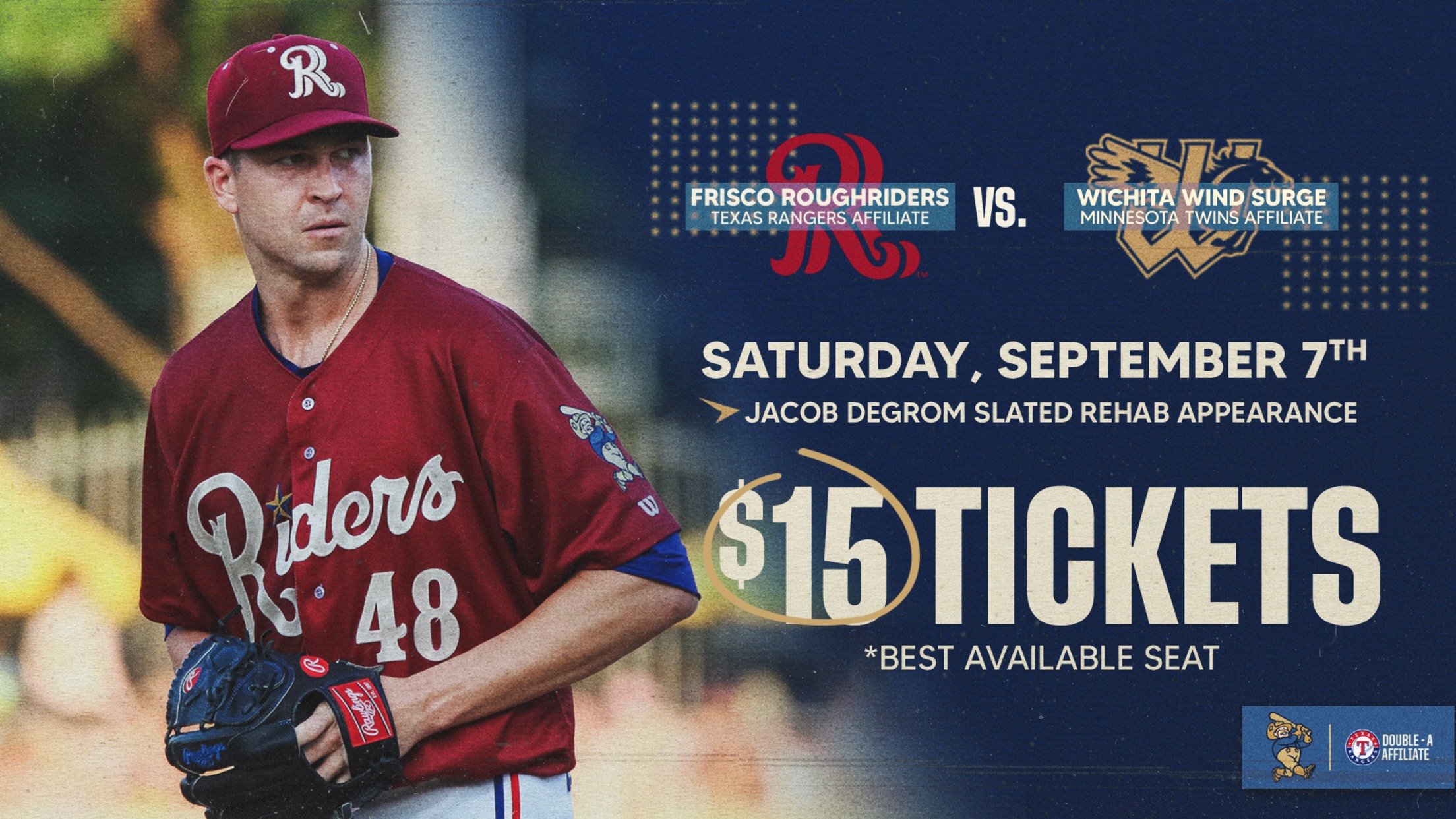 FRISCO, Texas (September 6, 2024) – Texas Rangers starting pitcher Jacob deGrom is expected to rehab with the Frisco RoughRiders on Saturday, September 7th at 7:05 p.m. when Riders meet the Wichita Wind Surge (Minnesota Twins) from Riders Field. Fans can grab $15 best available seats for Saturday by clicking