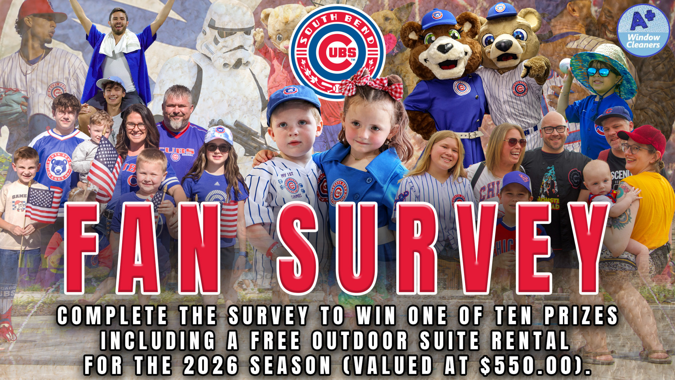All completed surveys will be entered into a raffle for ten prizes, and one grand prize. Each of the ten prizes will include a four-pack of tickets for a South Bend Cubs game in the 2026 season. The grand prize is a complimentary Four Winds Field outdoor suite experience at a 2026 South Bend Cubs game, with a $100 dining credit included. One entry per person. Suite offer valid for South Bend Cubs home games in 2026 between April 1 - May 15. Plus, everyone who enters will receive a special offer from A+ Window Cleaning.