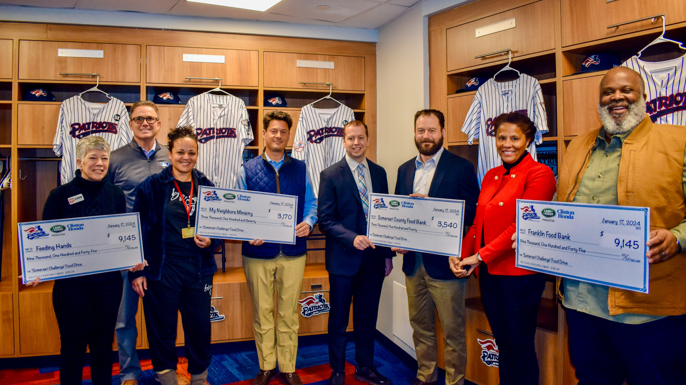 BRIDGEWATER, NJ – In an effort to address record demand at Somerset County food pantries, Somerset Patriots Co-Chairmen Jonathan and Josh Kalafer, this week presented checks totaling $25,000 to four area food banks and pantries, as part of a “Somerset Challenge” matching grant that produced more than $50,000 in total donations during the recent holidays. The donations are expected to help tens of thousands of Somerset County residents in need.