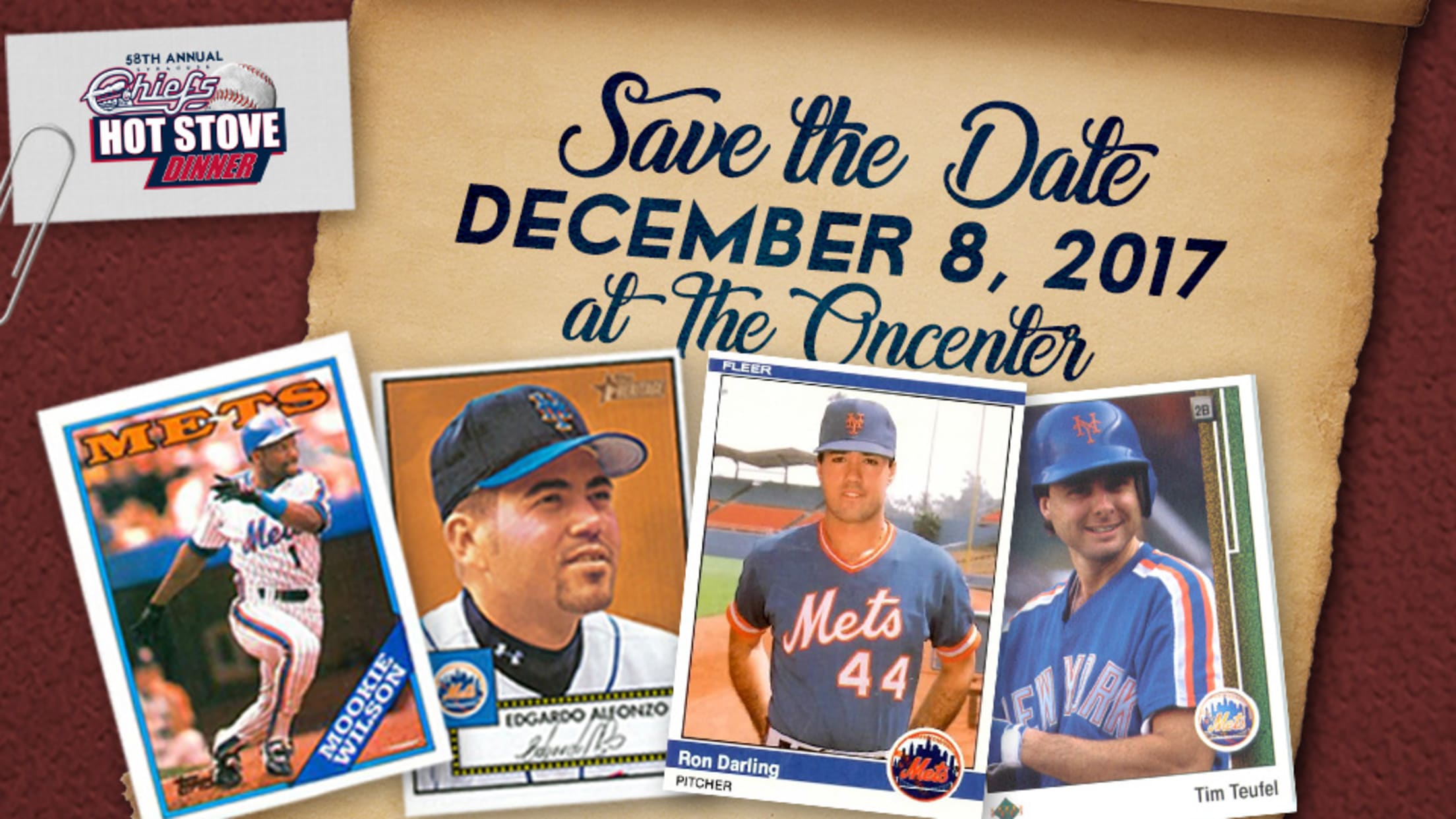The Syracuse Chiefs are excited to announce the 2018 Hot Stove Dinner speakers. Fomer Mets stars, Mookie Wilson, Edgardo Alfonzo, Tim Teufel & Ron Darling are all expected to attend the 58th Annual Hot Stove Dinner.