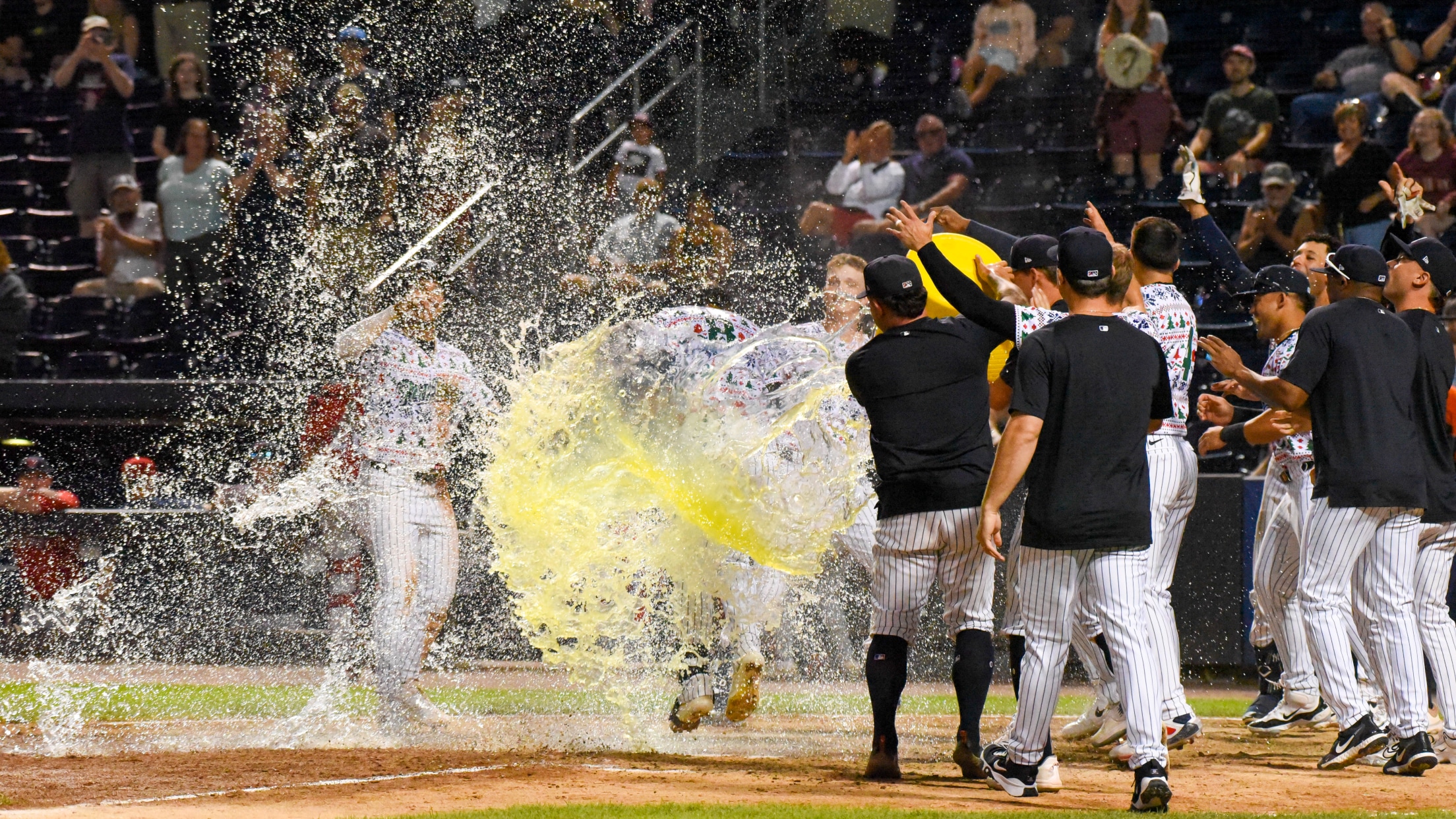 Oswald Peraza and the RailRiders celebrated a walk-off home run victory with a Gatorade bath at home plate. (Kirsten Peters)