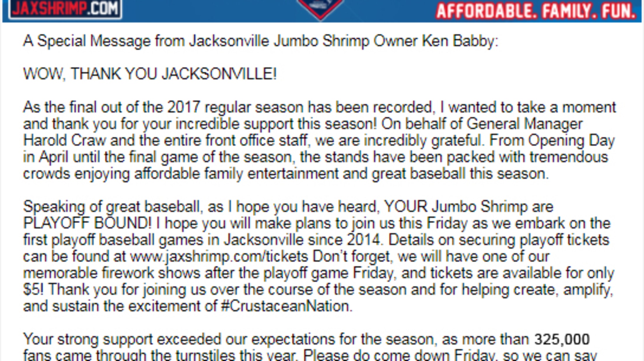 A Special Message from Jacksonville Jumbo Shrimp Owner Ken Babby September 4, 2017 Facebook Share X Share Email Copy Link [Empty Body] Read More: Jacksonville Jumbo Shrimp