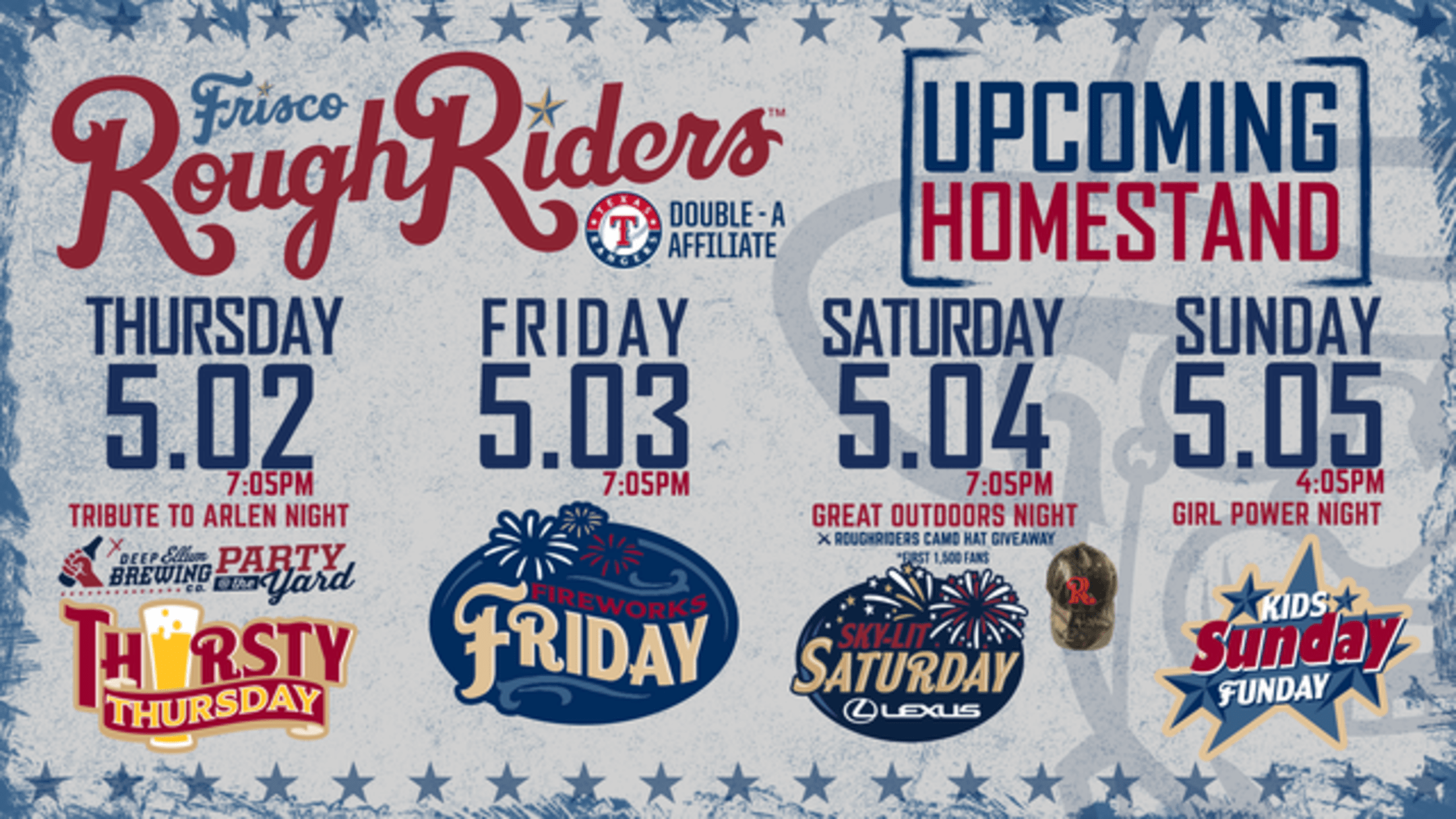 FRISCO, Texas (April 29, 2019) - The Frisco RoughRiders begin the month of May with a full week at home, playing a seven-game homestand Wednesday, May 1 through Tuesday, May 7 at Dr Pepper Ballpark.