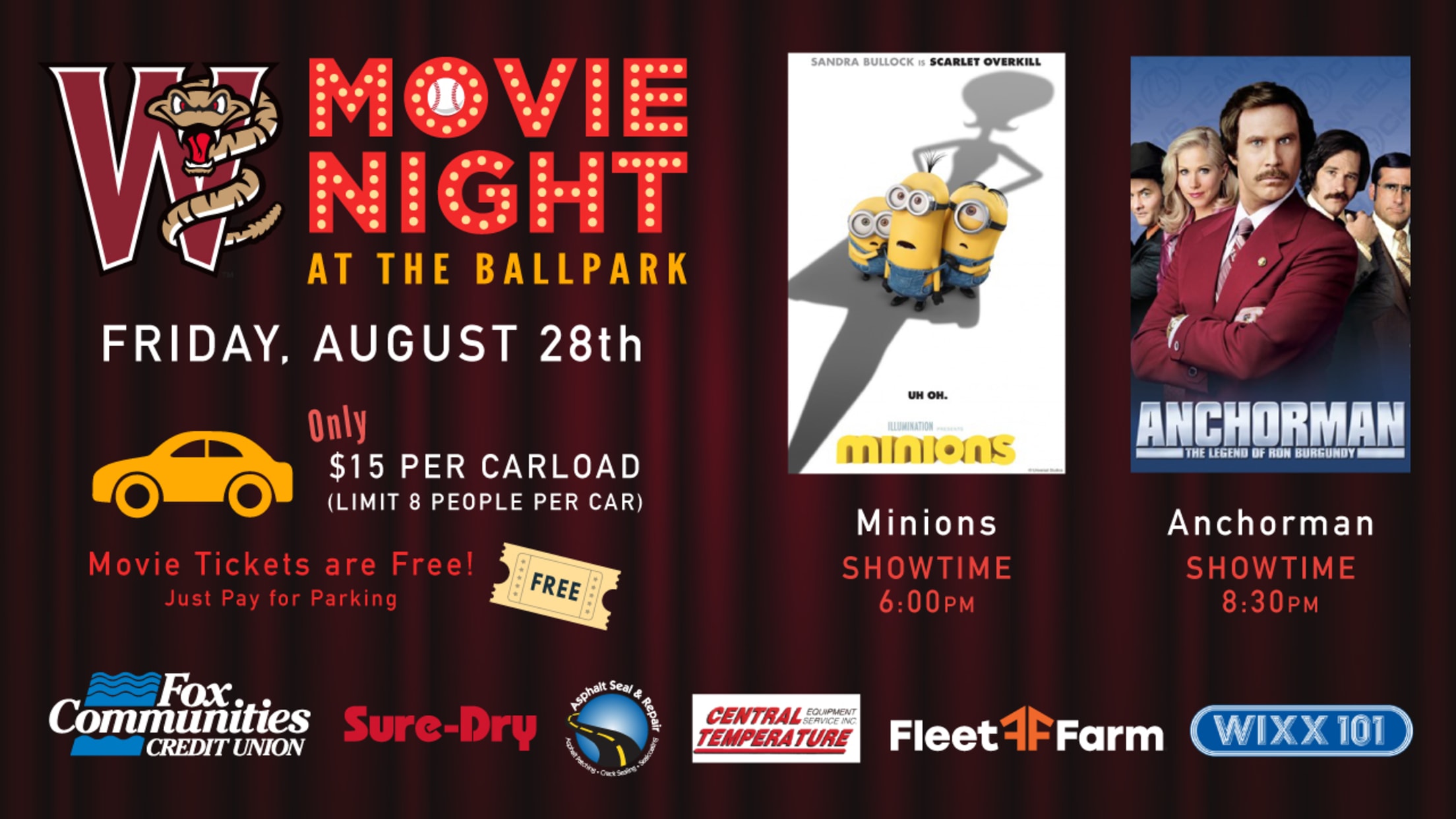 GRAND CHUTE, WI – The Wisconsin Timber Rattlers will show two movies on the videoboard at Neuroscience Group Field at Fox Cities Stadium on Friday, August 28 with Fox Communities Credit Union as the presenting sponsor. Minions will be shown at 6:00pm. The ballpark will be cleared after the movie and Anchorman will be shown at 8:30pm. Tickets to the movie nights are free of charge, but there is a $15 parking/carload fee. The parking pass along with the desired number of complimentary tickets, limit of eight tickets per car, must be purchased in advance. This movie night is also made possible by WIXX, Sure-Dry, Fleet Farm, Asphalt Seal & Repair, and Central Temperature.
