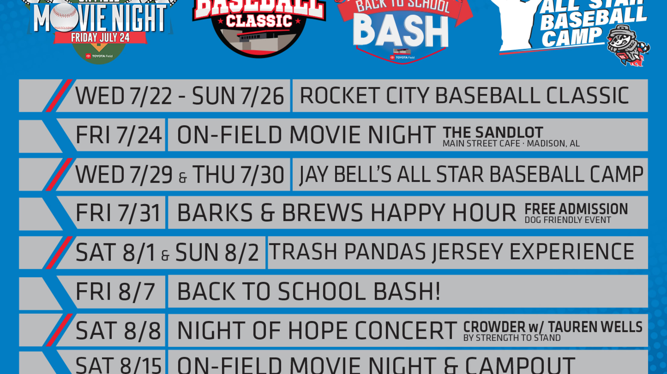 Fireworks, block parties, and movie nights have highlighted the summer at Toyota Field, and now the Rocket City Trash Pandas are adding a slew of new events to the calendar.