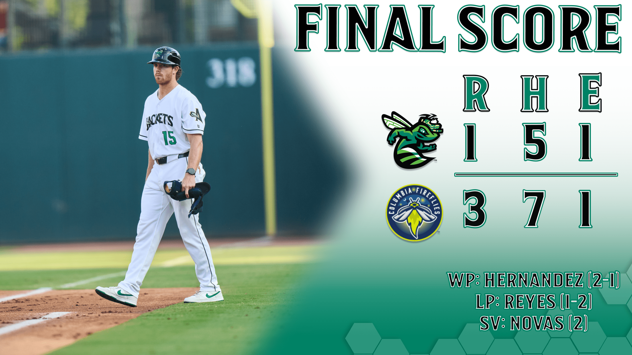 COLUMBIA, SC: The GreenJackets took a 1-0 lead three batters into the ballgame, but did not score afterwards as the Fireflies produced just offense to take a 3-1 victory Tuesday evening.