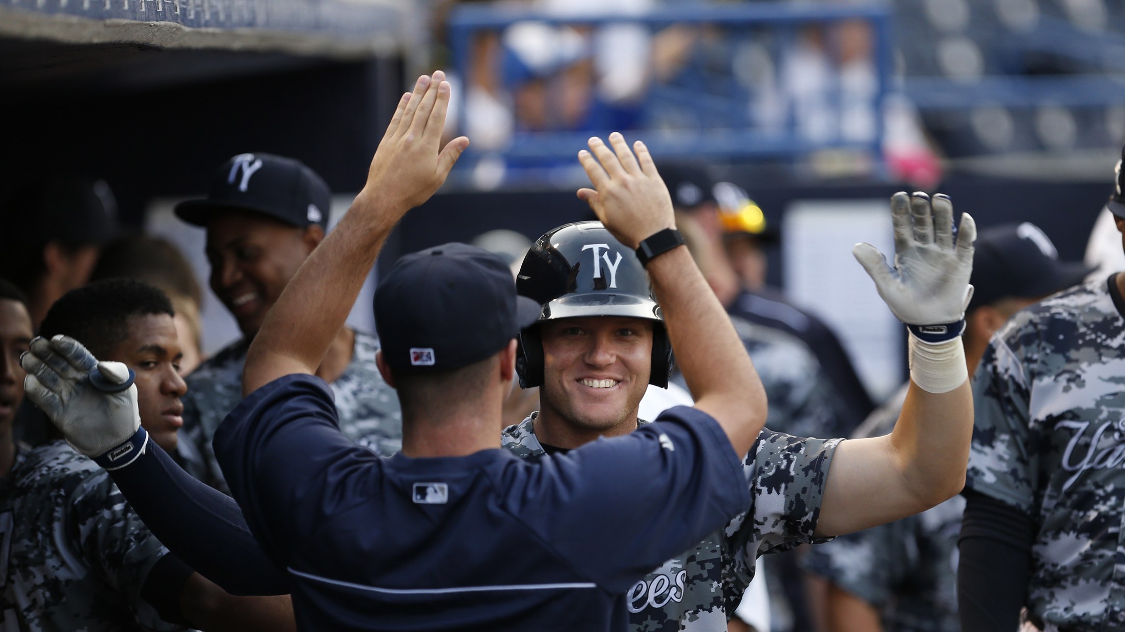 Trey Amburgey celebrates in the dugout after hitting a solo home run in the 4th inning of the 3-2 win by the Tampa Yankees on Saturday night at George M. Steinbrenner Field.