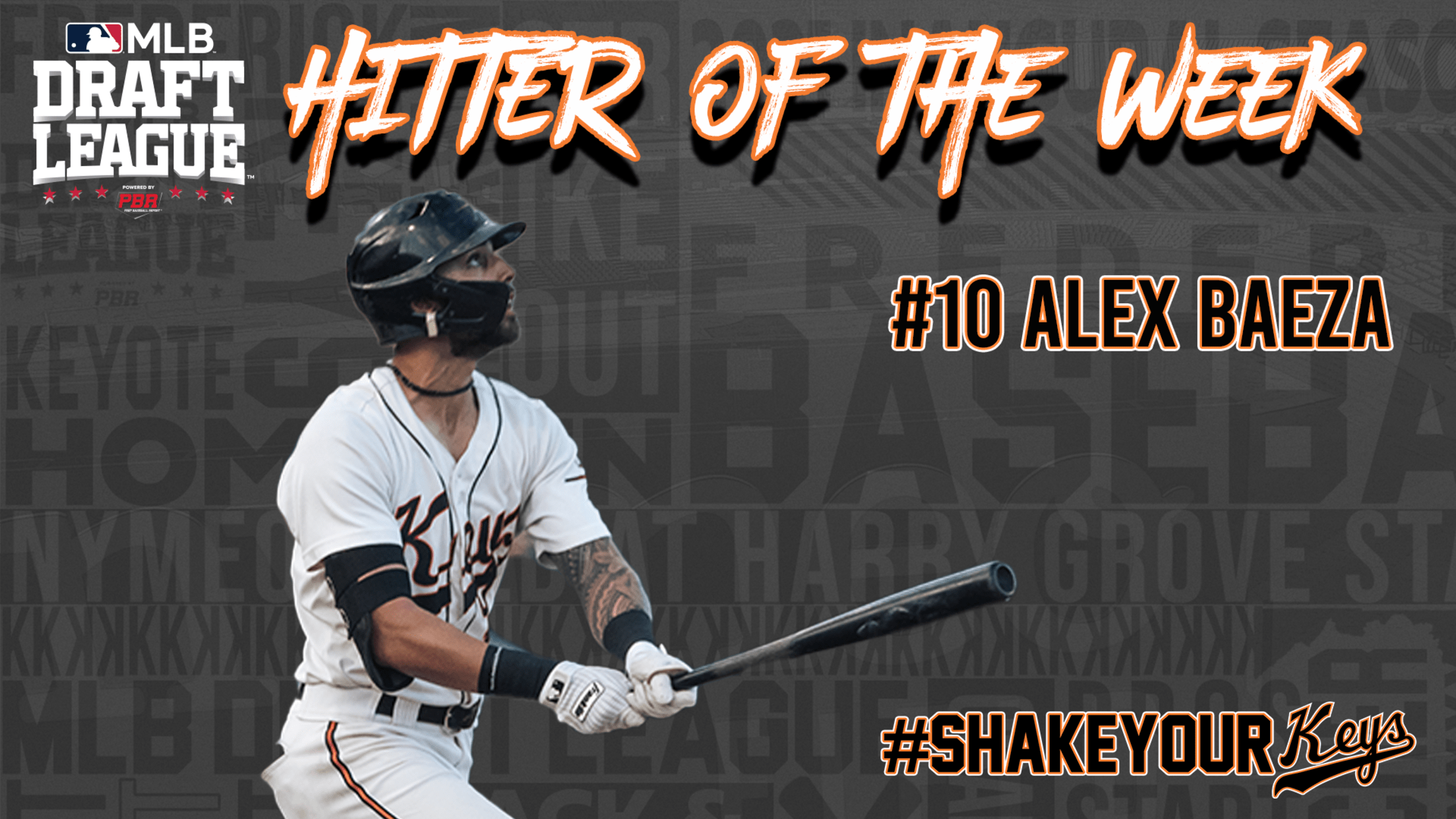 Baeza, 24, receives Hitter of the Week honors after batting .600 (6-for-10) with four home runs and six RBI in three games for the Keys. He paced all MLB Draft League hitters during the period in home runs, average, OBP (.667), slugging (1.900) and OPS (2.567), and finished tied for second in runs scored (6) and total bases (19).