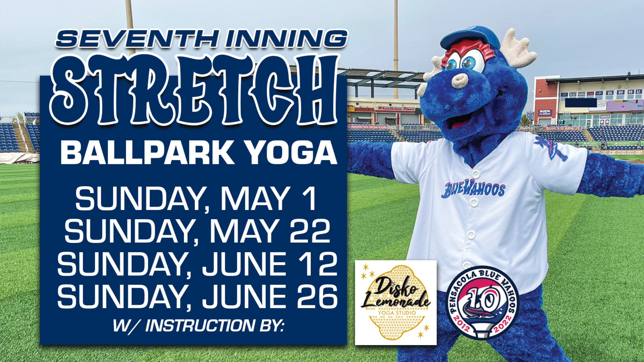 “After our first Ballpark Yoga session in April, we heard from so many fans clamoring for more, so we’re very excited to add four new dates this summer,” Blue Wahoos events manager Shannon Reeves said. “We’re very grateful to our friends at Disko Lemonade for leading these sessions and making them fun for all ages and experience levels.”