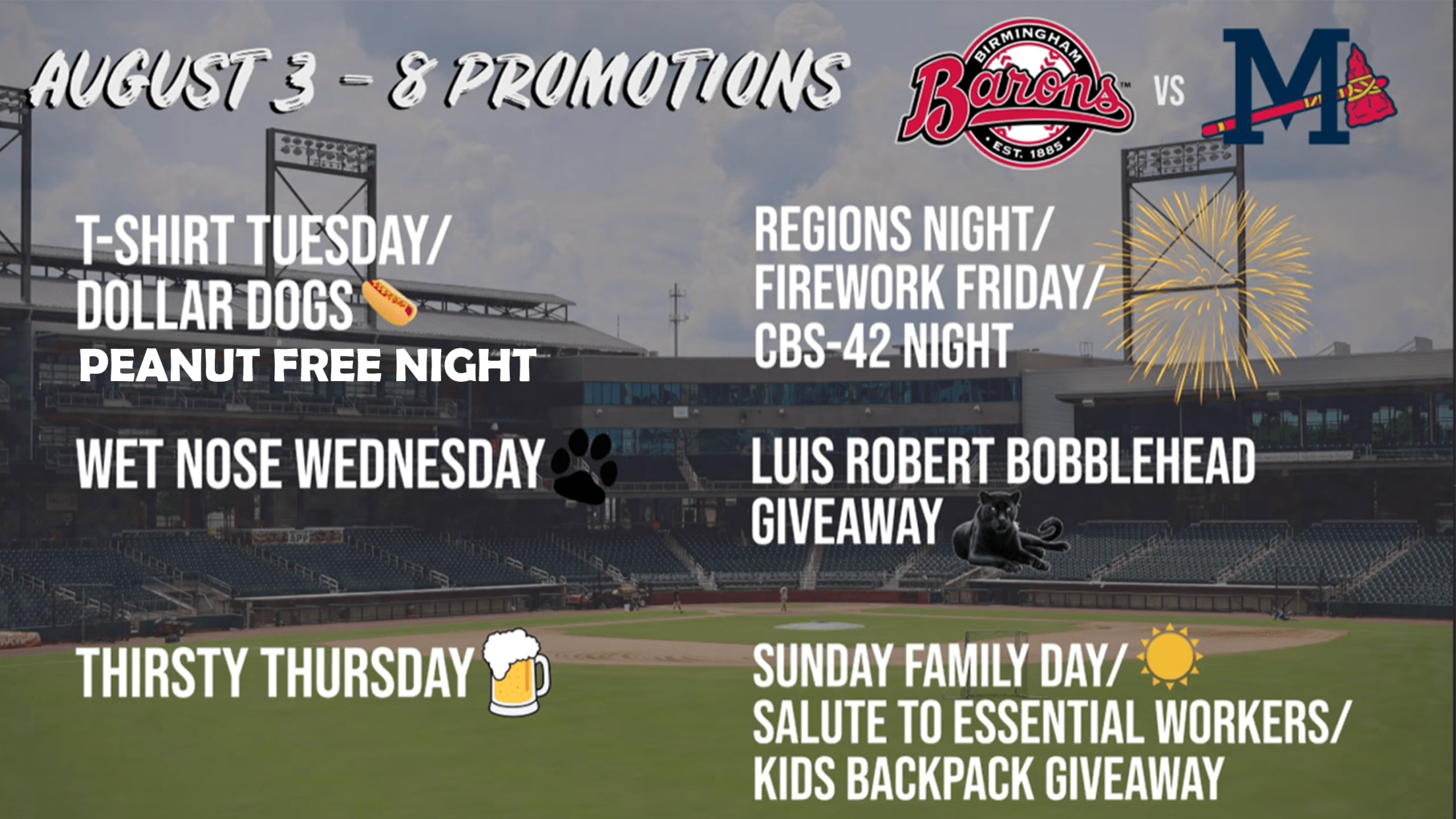 The Birmingham Barons are back in the Magic City next week as they kick off a 12-game series starting on Tuesday, August 3rd and ending on Sunday, August 15th. The Barons will face the Mississippi Braves in the first six games of the homestand which will feature Thirsty Thursday, a