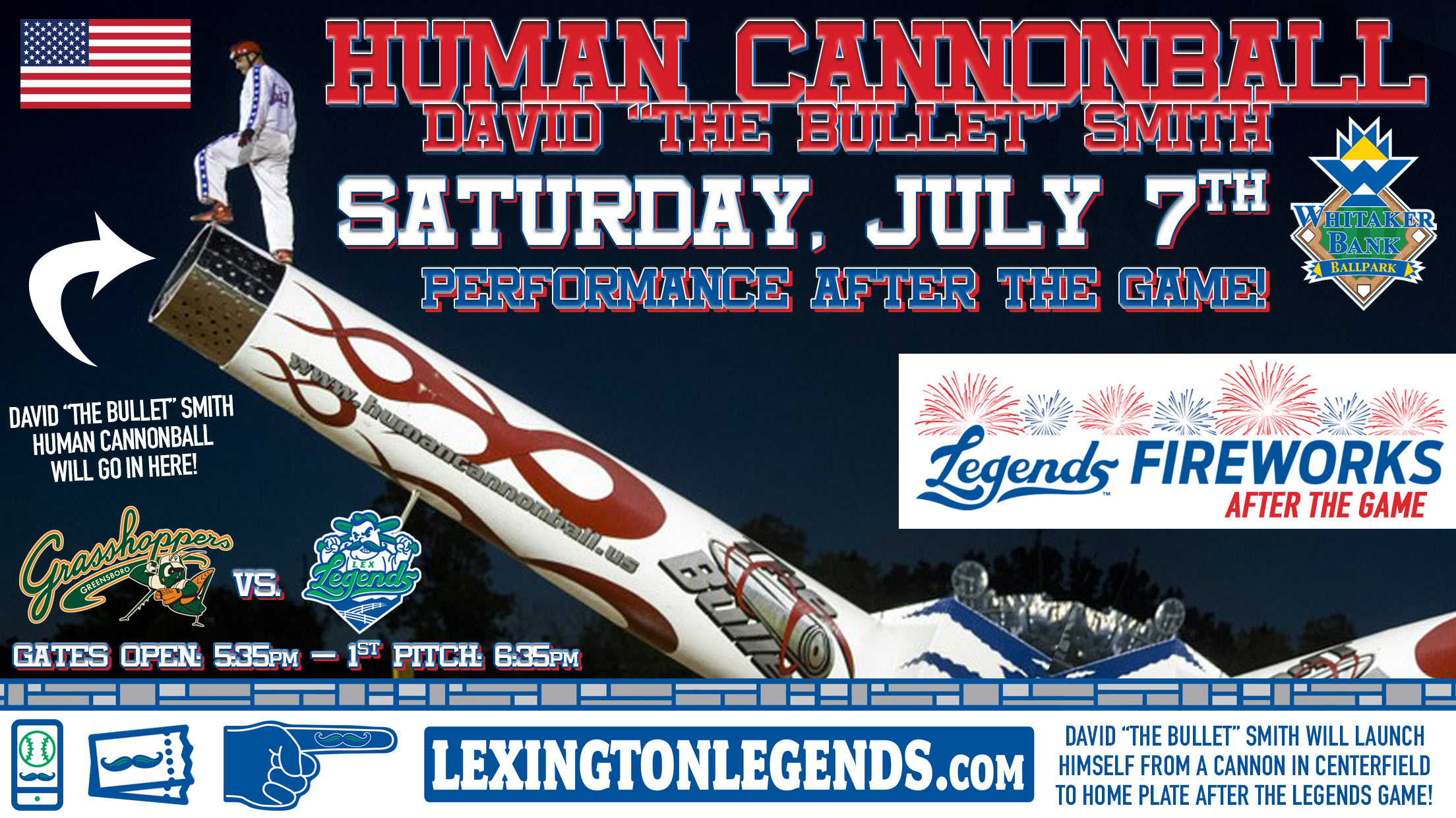 Saturday, July 7 at 6:35 p.m. vs. Greensboro: David "The Bullet" Smith will perform his death-defying Human Cannonball performance immediately following the Legends 6:35pm game on Saturday, July 7 against the Greensboro Grasshoppers. David has been a human cannonball for 22 years and has performed over 8,000 cannon shots in fifteen countries and is the highest-flying human cannonball in the world today. During his post-game feat, he will project himself over 150 feet out of his world-famous 35-foot-long cannon from centerfield towards home plate. The World Record Breaking Human Cannonball David "The Bullet" Smith amazes audiences across the world! Watch him astonish the live audience at Whitaker Bank Ballpark with this powerful and unforgettable live performance! Fans will also be treated to a fireworks show following the Human Cannonball! Both experiences are included in your Legends ticket!