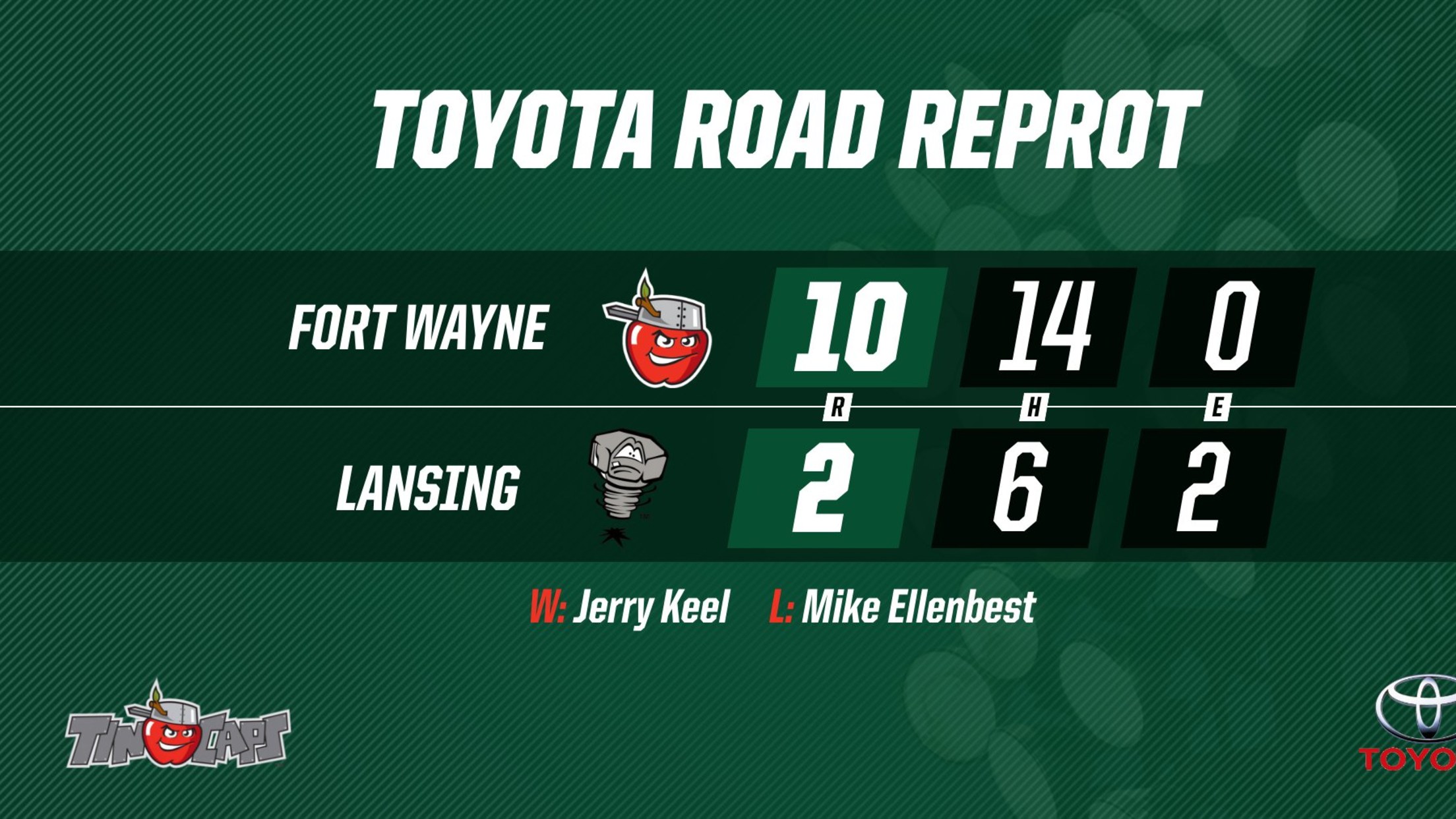 LANSING, Mich. -- With a 14-hit attack, the TinCaps clobbered the Lansing Lugnuts (Toronto Blue Jays), 10-2, on a pleasant Monday night at Cooley Law School Stadium.