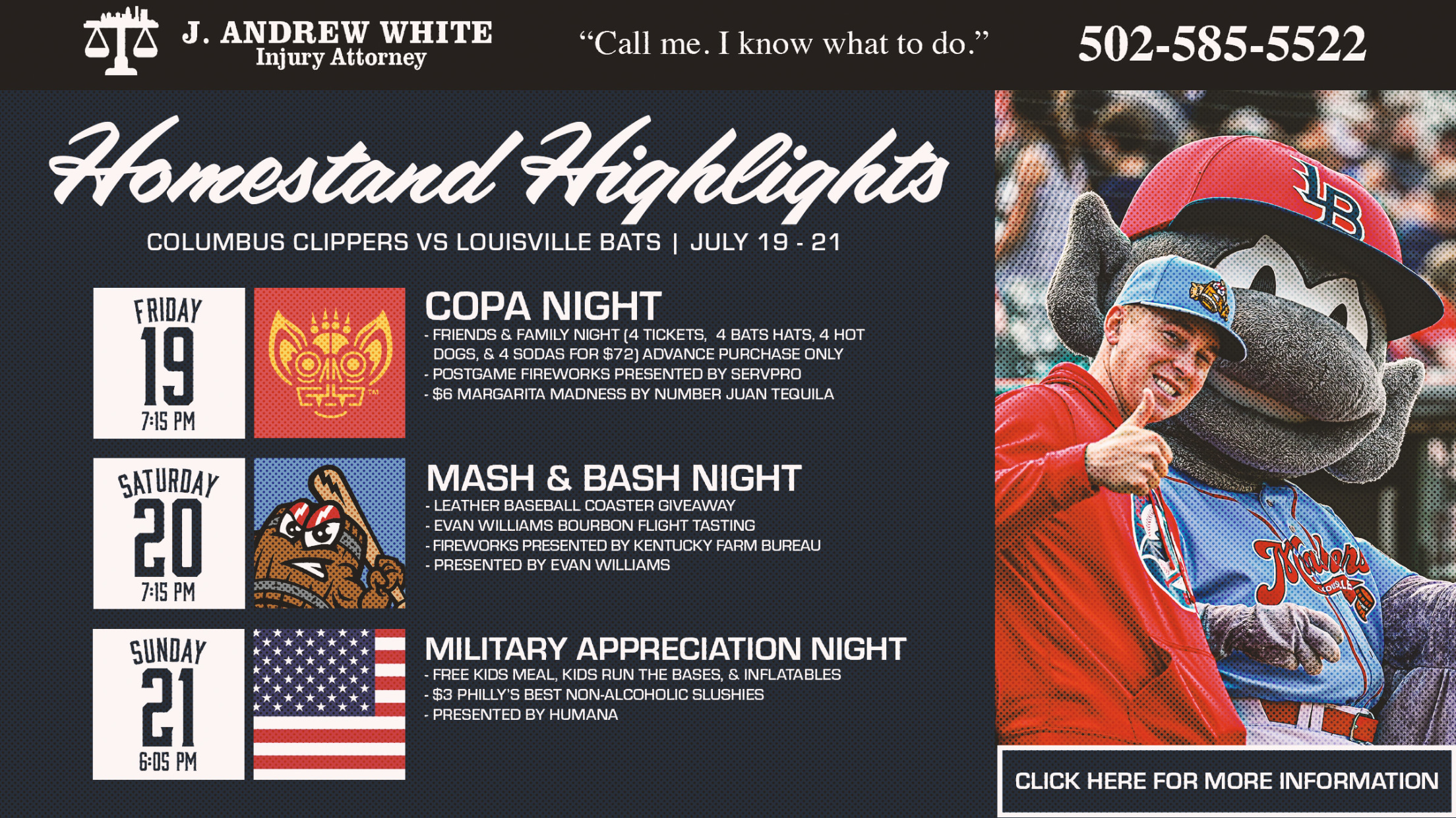 - Mashers Night: The Bats will don their unique Mashers jerseys as they play as the Louisville Mashers, presented by Evan Williams.