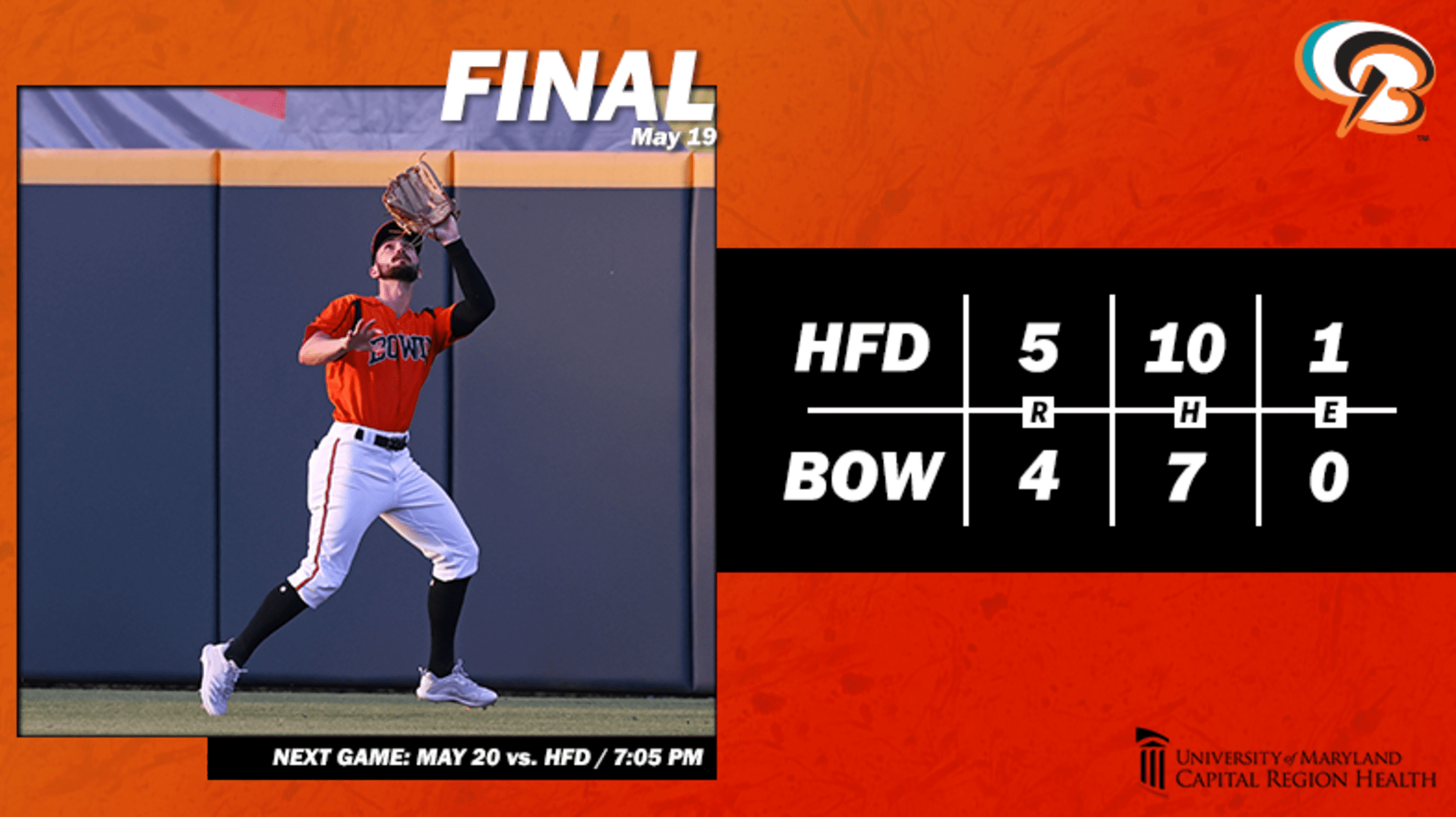 BOWIE, MD – The Bowie Baysox lost a 5-4 stinger to the Hartford Yard Goats on Thursday as the Baysox falter to lose their seventh game in a row. Bowie jumped ahead to a 3-2 advantage after a lengthy first inning, but fell behind on a two-run home run later in the game. After Bowie tied the game at four, Daniel Cope’s solo home run in the ninth inning spoiled Bowie’s chances.