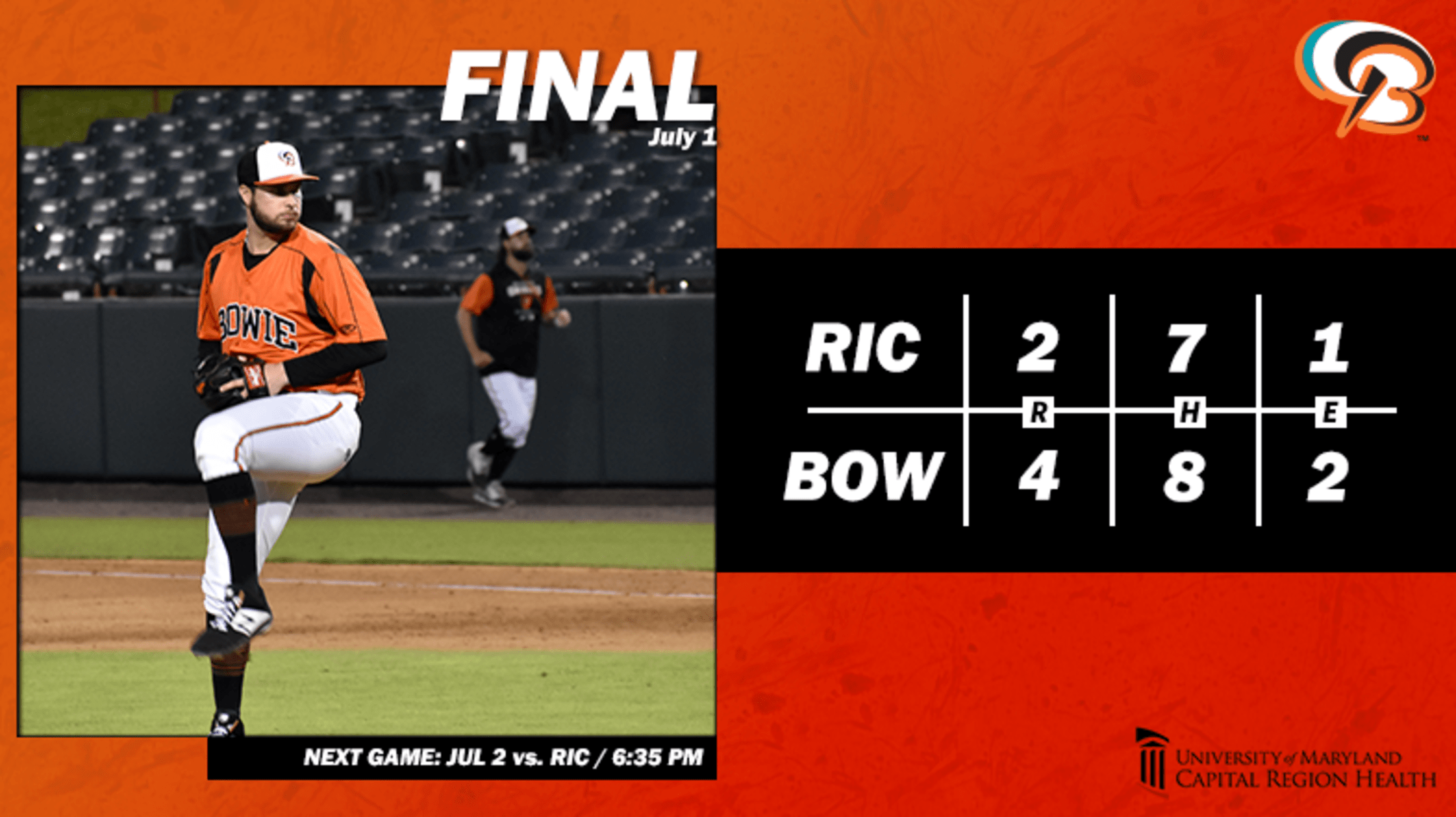 With the win, Bowie bumps to 4-0 in the second half of the season and 31-42 overall. Bowie and Richmond will meet again on Saturday for the fifth game in their series, with the first pitch set for 6:35 p.m.