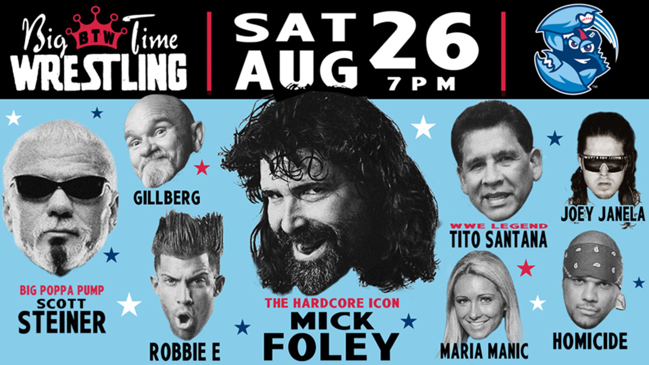Multi-Time Heavyweight Champion Mick Foley along with more great wrestling superstars headline a special Big Time Wrestling event at FirstEnergy Park on Saturday, August 26th with a bell time of 7:00 p.m. (gates open at 5 pm).