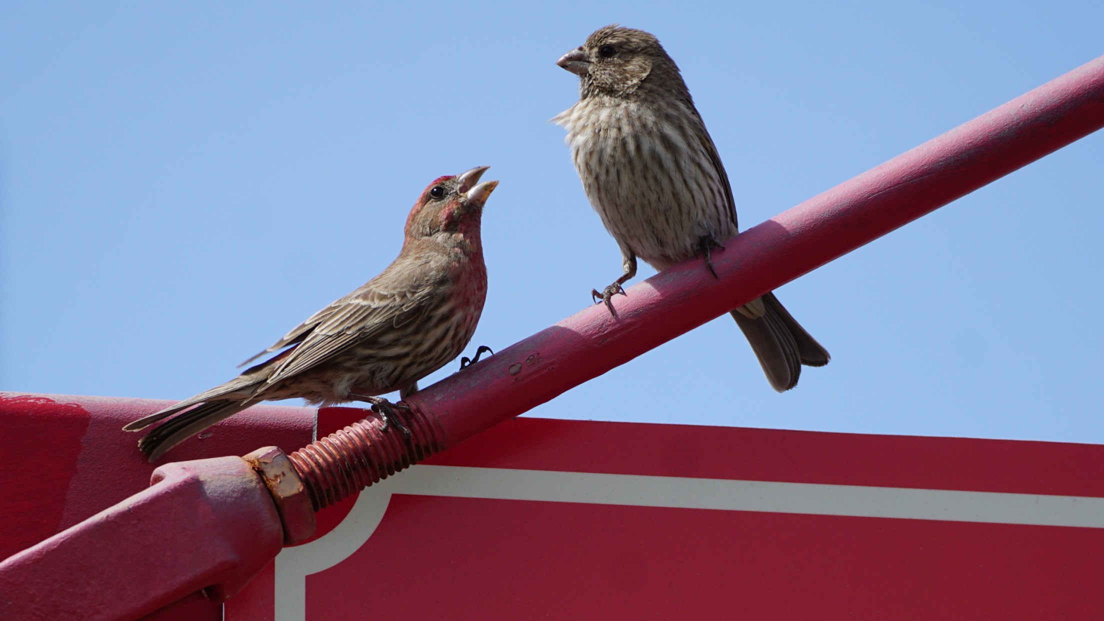 The most widely distributed songbird in North America, house finches are a common sight at Avista Stadium where they feast on leftover sunflower seeds and nest in various structures throughout the ballpark. Male finches can be identified by their reddish head and breast, which comes from pigments contained in their food during molt. The male pictured on the left in this photo is attempting to “woo” a female finch through song atop the main concession stand. If the two birds pair up, they will remain monogamous and typically raise 1-3 broods per year with 3-6 eggs in each brood. Once found only in the western United States, house finches were introduced to Long Island, NY in the 1940s and quickly spread across the continent.