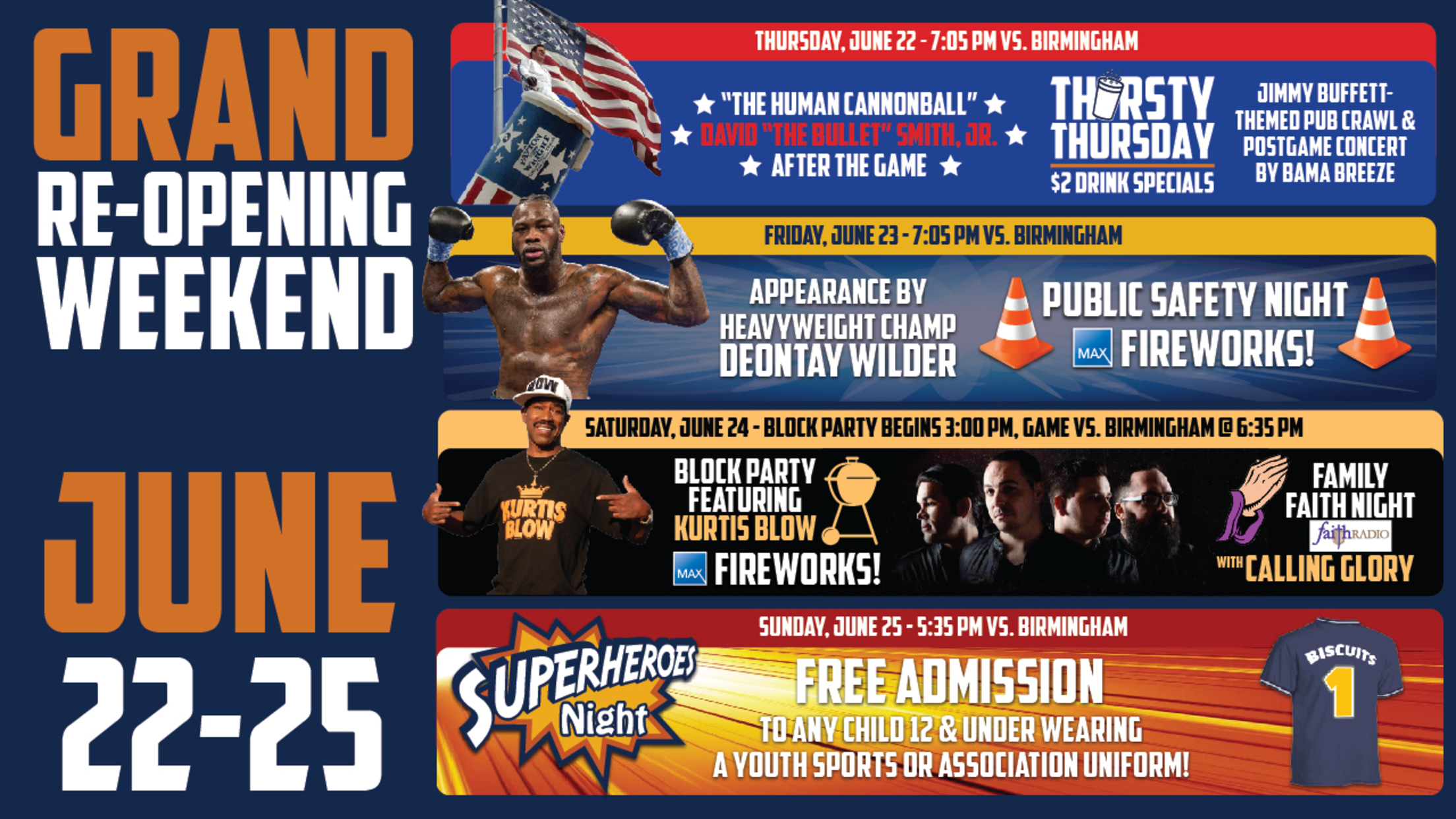 "Our new Ownership group, our Management team, and the Biscuits' staff that you've come to know are excited to usher in a new era for Montgomery Baseball on 'Grand Re-Opening Weekend'," said Lou DiBella. "From the amazing Human Cannonball, Alabama's very own heavyweight champion of the world, legendary hip-hop pioneer (and minister) Kurtis Blow to a block party, live music and non-stop family fun, we're going to show you what we've got. We're going to begin the second half of the Montgomery Biscuits season with the kind of excitement and community spirit that we want to bring to the Greater Montgomery Area 12 months a year, for many years to come. These Biscuits will be hot."
