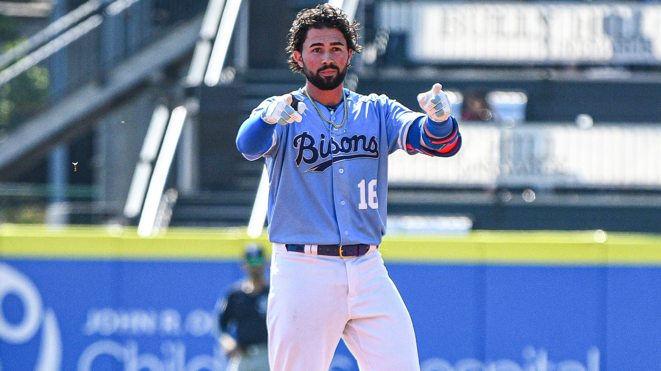 Payton Henry points to the Bisons dugout after his RBI double in the first inning. (Marissa Packard)