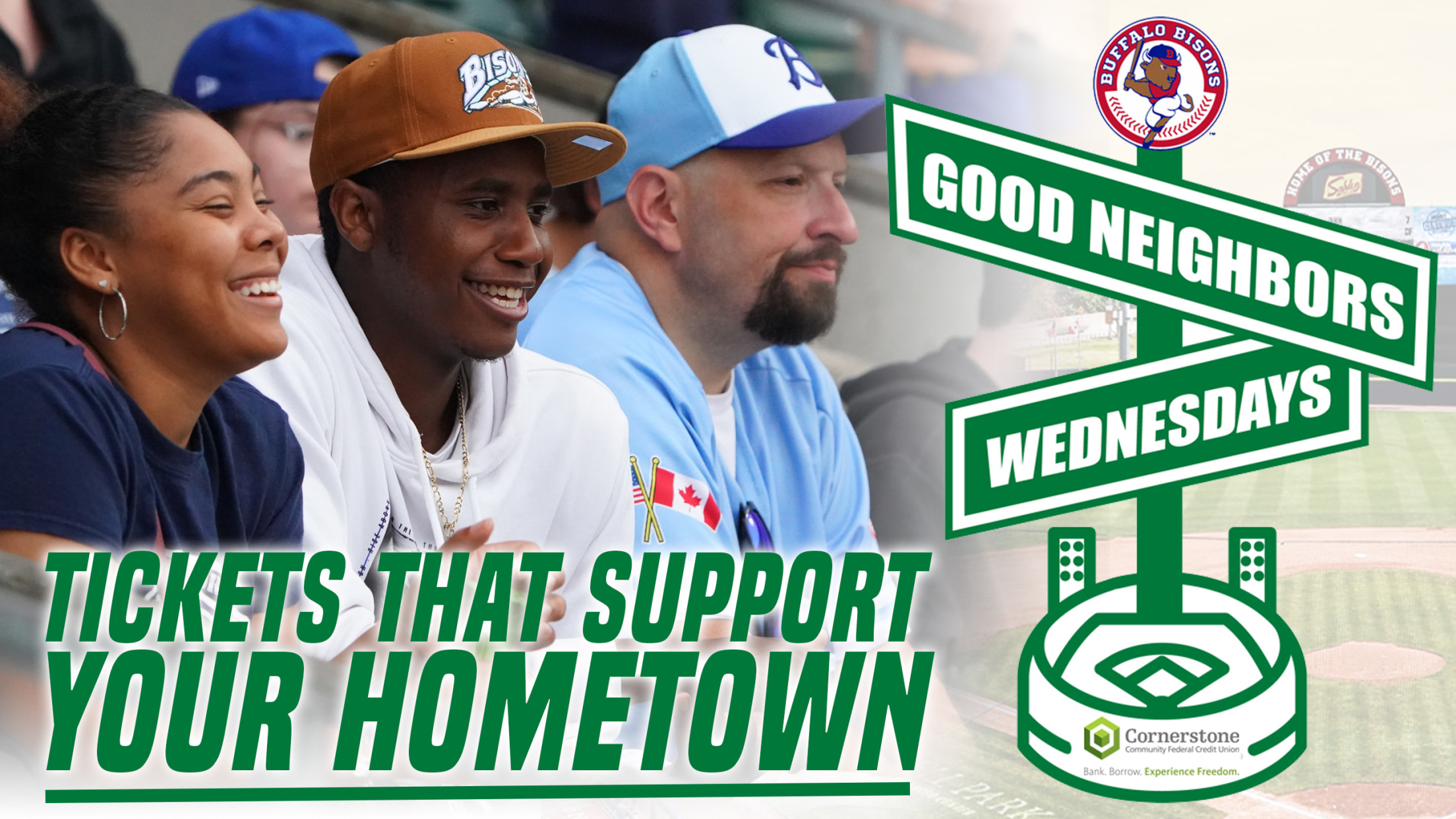 PURCHASE YOUR 'GOOD NEIGHBOR WEDNESDAYS' TICKETS The Buffalo Bisons today announced an exciting new promotion that is a reflection of Western New York’s giving spirit and unwavering sense of community. In 2024, all Wednesday Bisons home games will be known as “Good Neighbors Wednesdays,” presented by Cornerstone Community Federal Credit