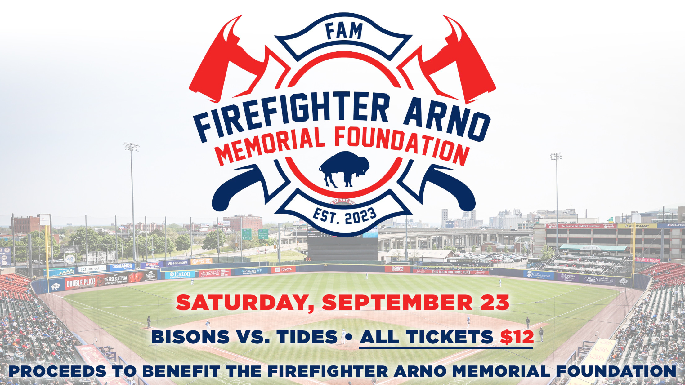 Get my September 23rd Game Tickets The Buffalo Bisons today announced that for their game on Saturday, September 23 against the Norfolk Tides (4:05 p.m.) all Single-Game Tickets will be $12 each with proceeds of every ticket sold being donated back to the Firefighter Arno Memorial Foundation. Fans can purchase