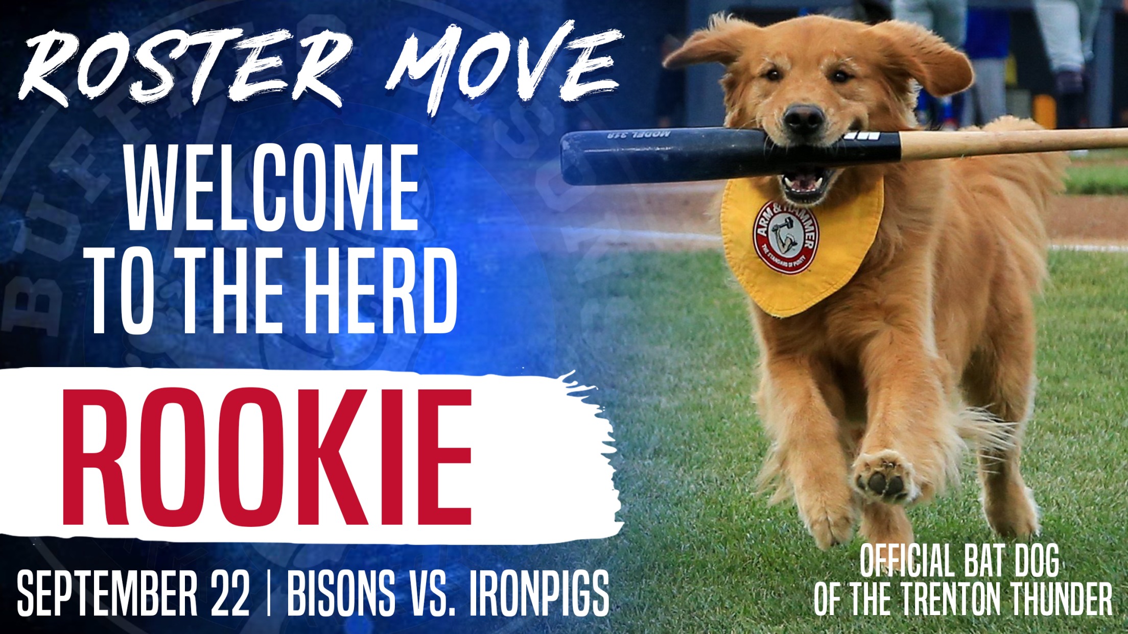 Beloved by baseball fans throughout New Jersey and minor league baseball, Rookie was a key contributor to the Bisons success while playing the first half of their home schedule at Trenton Thunder Ballpark. Rookie (@BatDogRookie on twitter and Instagram) will once again be put to work by the Herd, retrieving bats for his Bisons teammates early in the club’s game against the IronPigs. Rookie is the Thunder's Third Generation Bat Dog following in the Paw Steps of his Grandfather Chase, and his father Derby. The story of all 3 Bat Dogs was told in the Emmy Nominated ESPN E-60 segment "The Family Business".