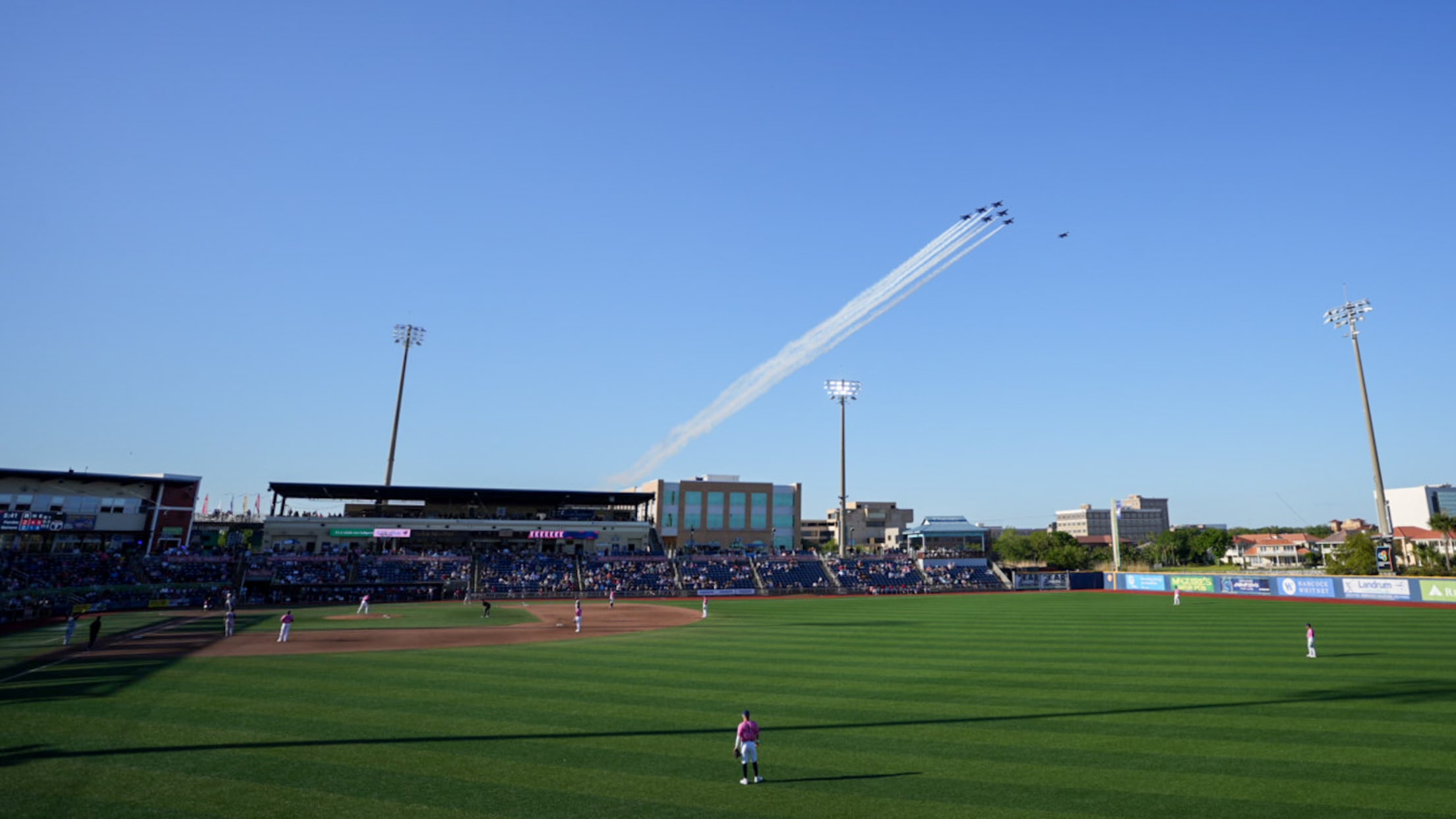 ---- There were two outs in the top of the seventh at 5:43 p.m. when the unmistakable roar of the Blue Angels jets were heard a split- before the jets buzzed over the stadium.