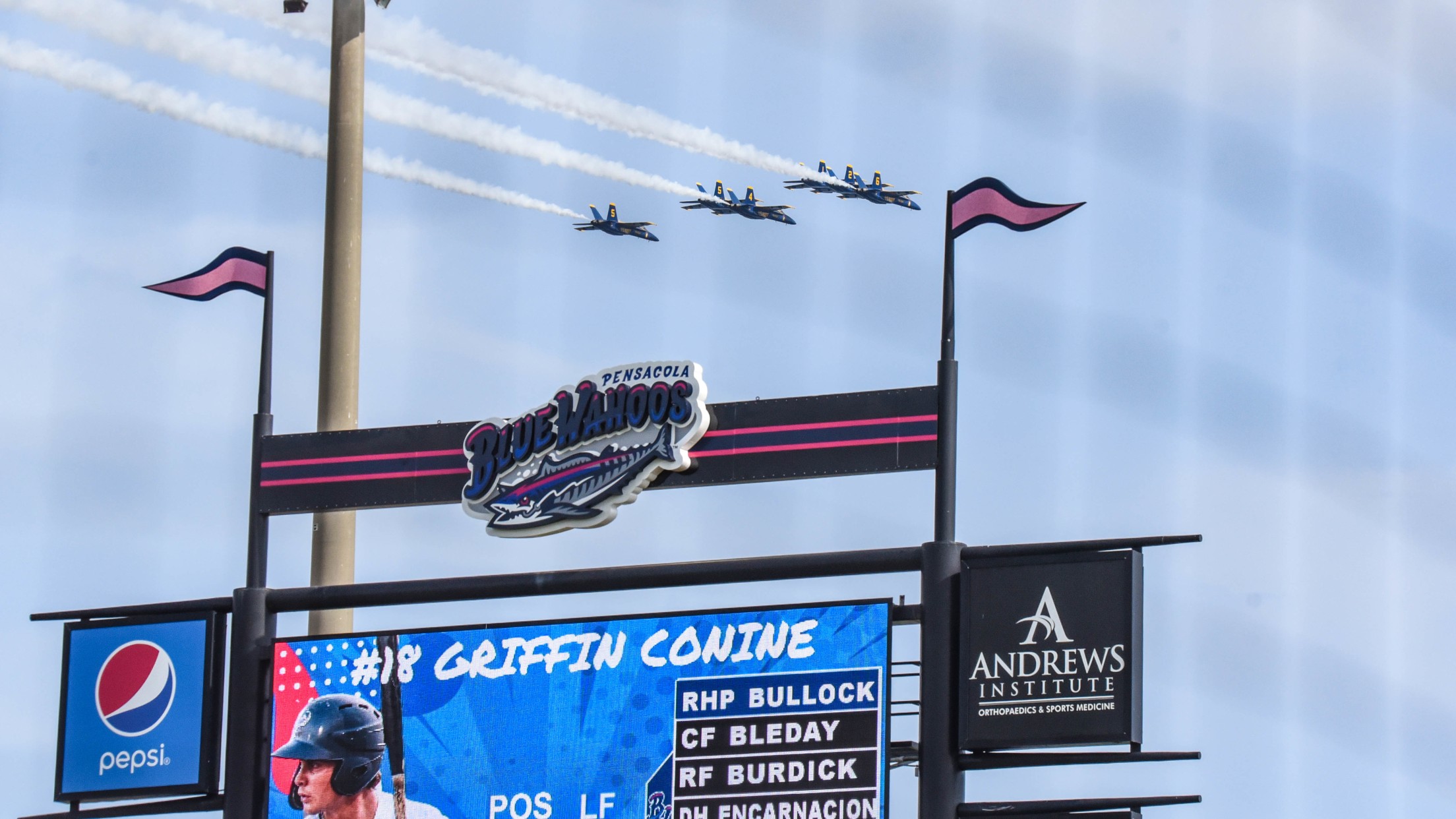 The spontaneous crowd murmur caught outfielder Griffin Conine’s attention, followed by a roar from the sky as the famed jets approached. Yes, the Blue Angels actually buzzed low Sunday across Blue Wahoos Stadium -- on the way home from performance at an air show in Chicago -- and right above