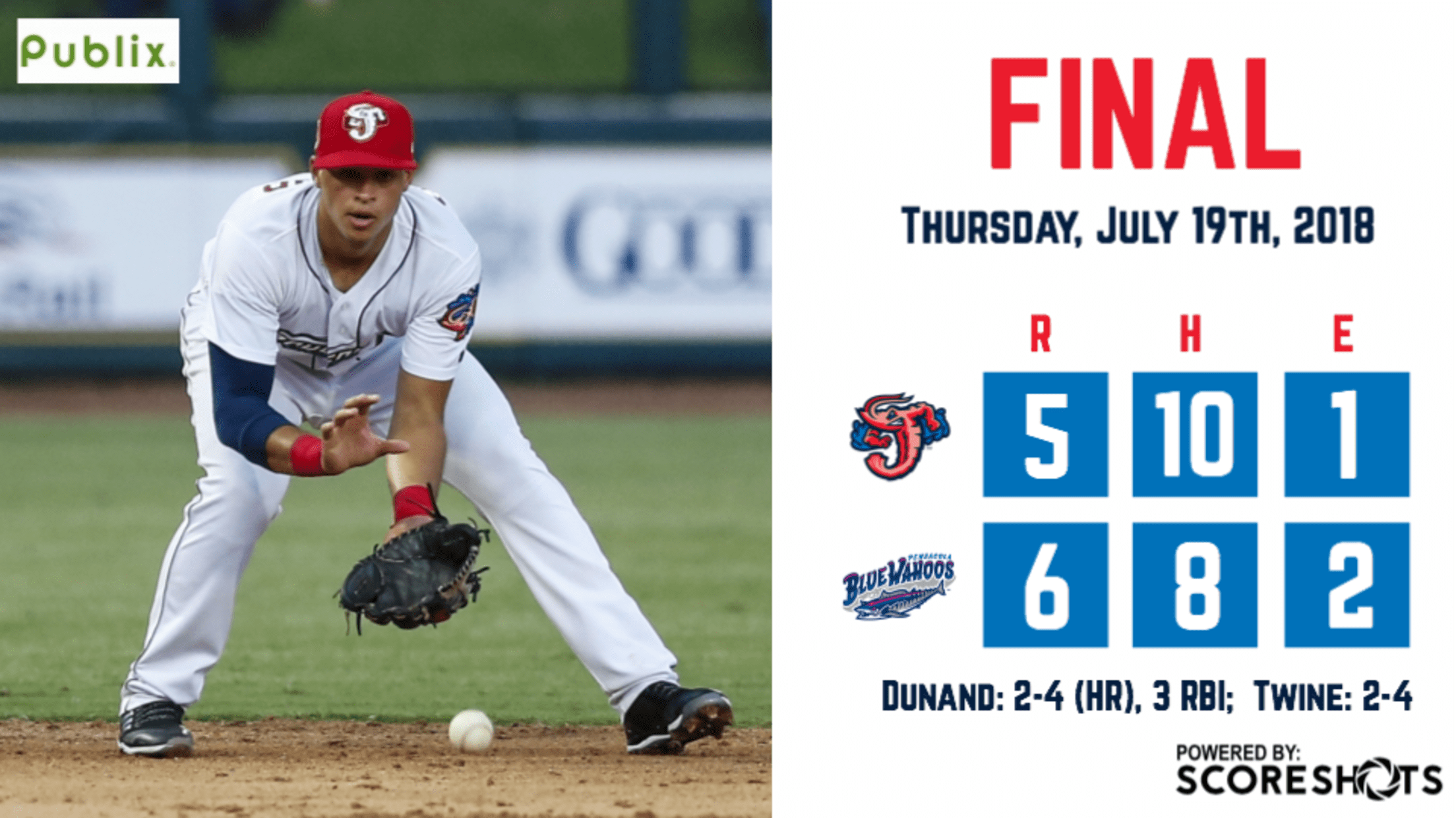 PENSACOLA, Fla. - Trailing 6-1 in the eighth inning, the Jacksonville Jumbo Shrimp rallied for four runs, including a three-run home run by shortstop Joe Dunand, but the Pensacola Blue Wahoos retained the lead for a 6-5 win in the second game of a five-game series at Blue Wahoos Stadium Thursday night.