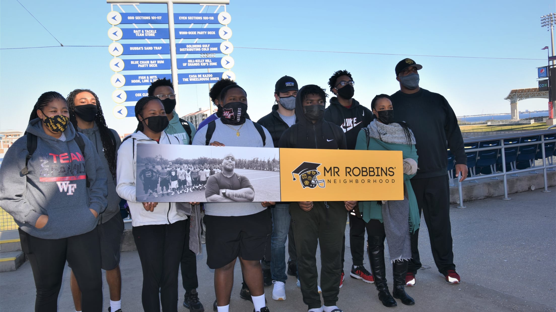 Crystal blue sky and the welcome return of warmer temperatures added to the experience, as members of Mr. Robbins’ Neighborhood gathered at Blue Wahoos Stadium. A group of area high school athletes in the Playbook Program were together Feb. 20 for the first time since the 2020 school year ended