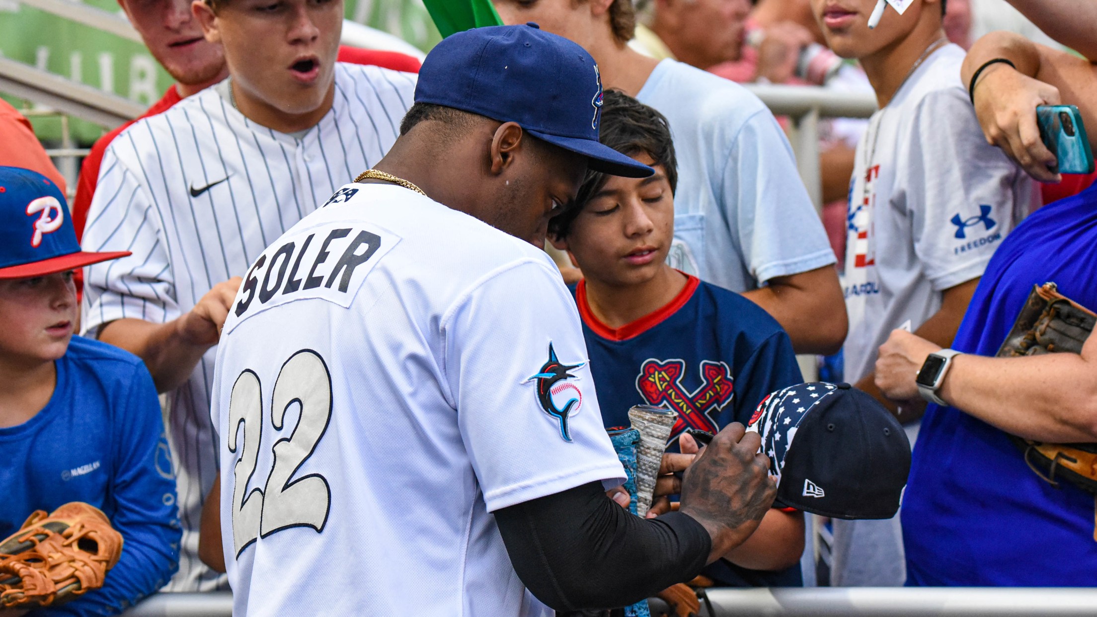 Soler was a free agent acquisition by the Miami Marlins, following his instant-legend status in Atlanta, after being the 2021 World Series MVP in the Braves championship win against the Houston Astros. He extended his fan engagement prior to being in the Blue Wahoos lineup for their weather-delayed, 2-1 victory Tuesday night against the Chattanooga Lookouts.