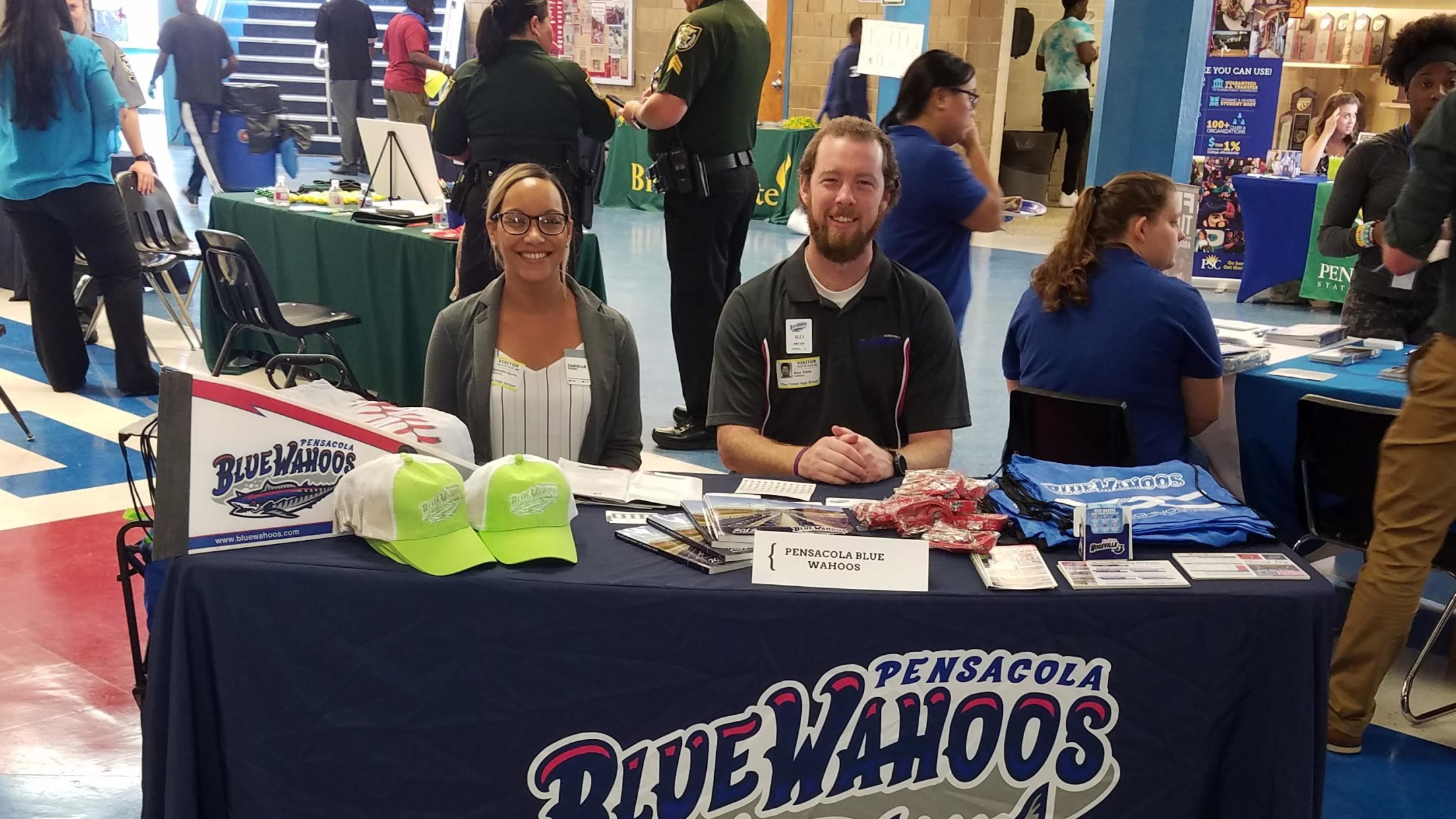 Career day at Pine Forest High School enabled the Blue Wahoos to help broaden their awareness.Seated in front of a Blue Wahoos table cover, complete with informational material and giveaway items, Alex Sides, the team's vice president of sales, along with Danielle Djuric assistant human resources assistant, provided insight Tuesday