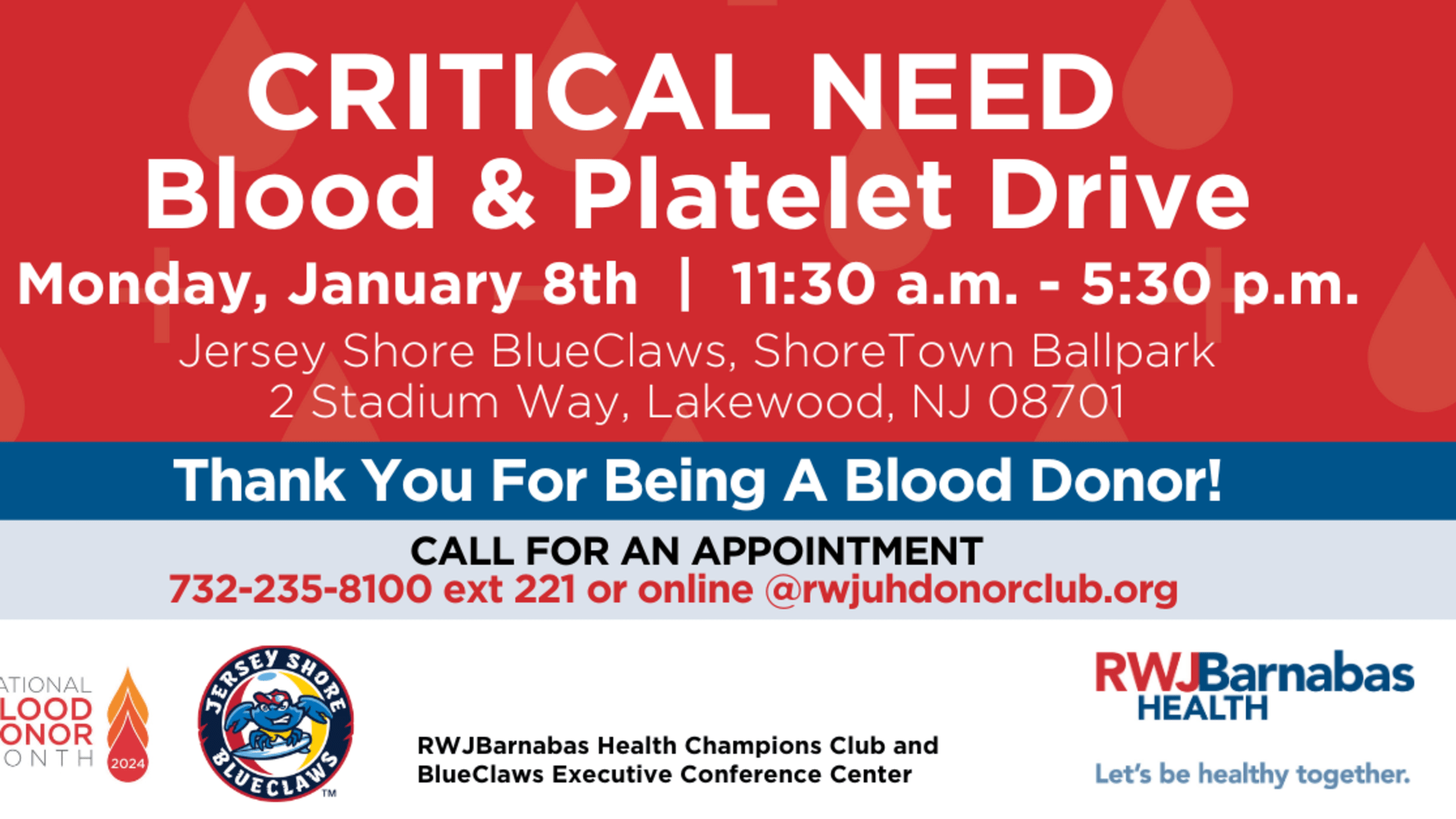 JERSEY SHORE, NJ - The BlueClaws and RWJBarnabas Health will partner on an Emergency Blood & Platelet Drive at ShoreTown Ballpark Park on Monday, January 8th from 11:30 am until 5:30 pm. The current blood supply is at critical levels and the need for donors is extremely high. Pre-registration is