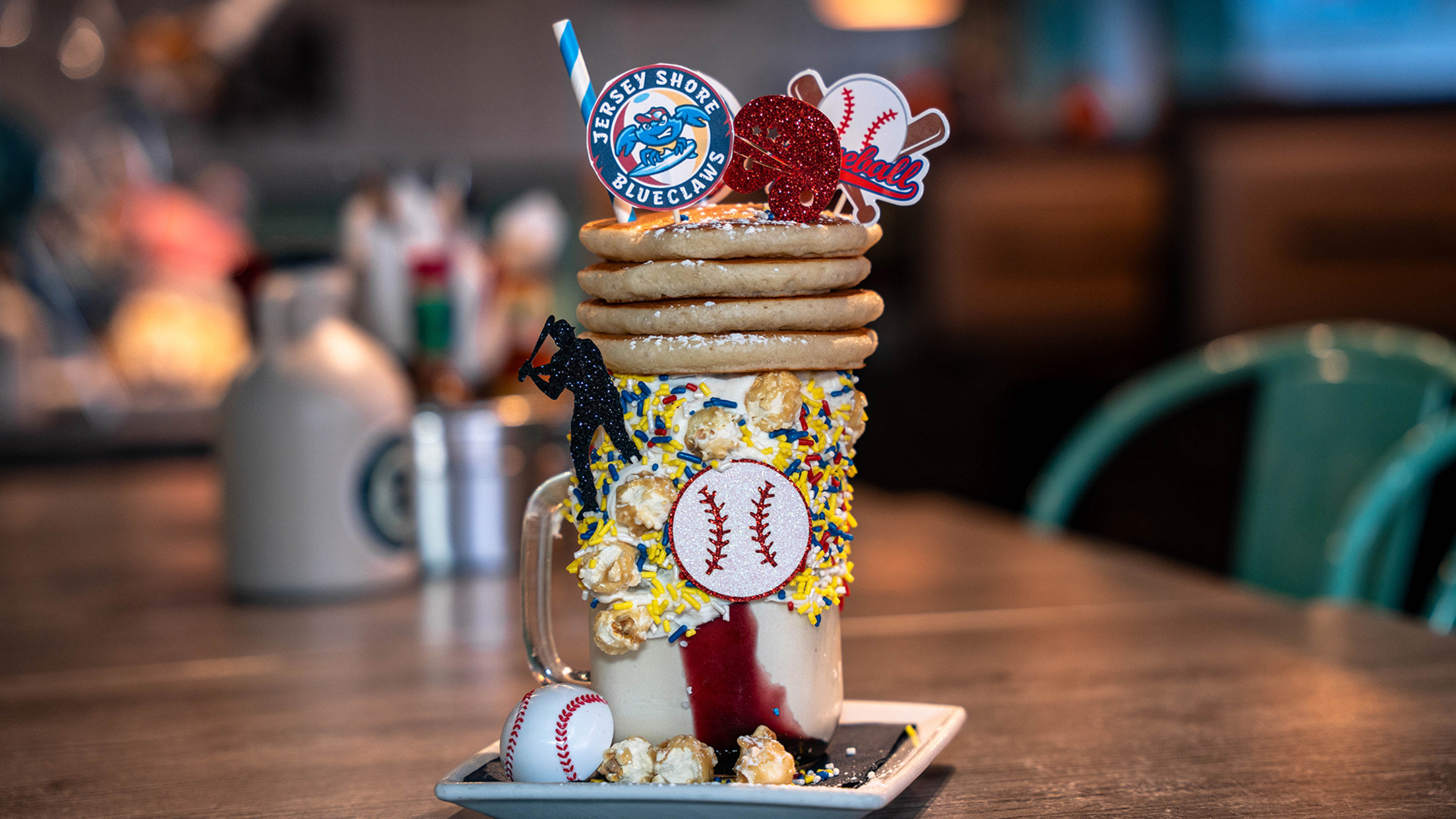 JERSEY SHORE, NJ – A delicious vanilla milkshake with sprinkles, Cracker Jacks, and more, all topped with three luscious pancakes - the BlueClaws Ultimate Insane Shake is coming to Brownstone Pancake Factory.