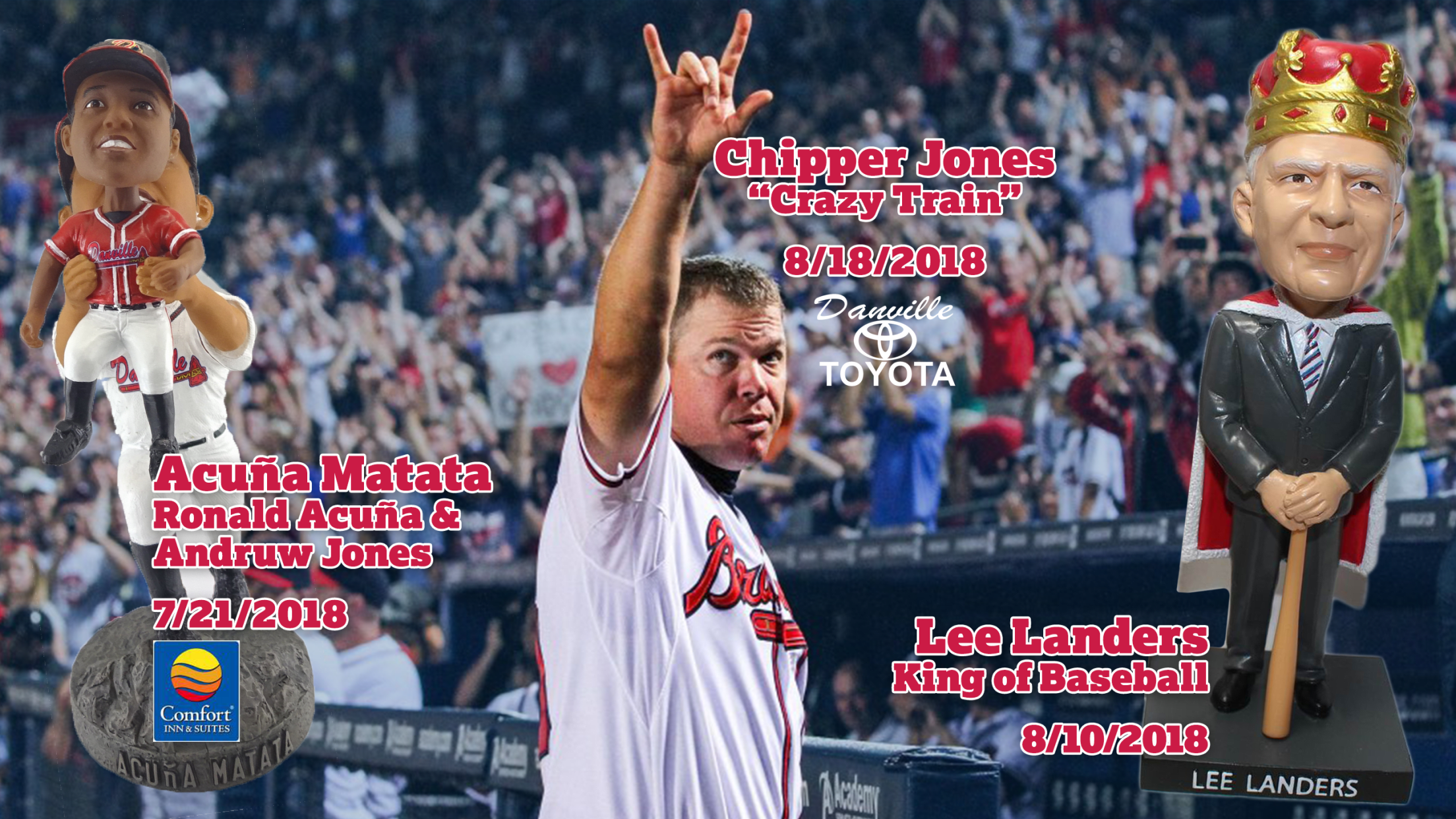 The Danville Braves' bobblehead promotions conclude with a Chipper Jones "Crazy Train" bobblehead presented by Danville Toyota on August 18. The first 500 fans through the gates will receive a bobblehead of the Atlanta Braves legend who will be inducted into the Baseball Hall of Fame this July. The special bobblehead plays Ozzy Osbourne's "Crazy Train," which was Jones' trademark walkup song during his career in Atlanta.