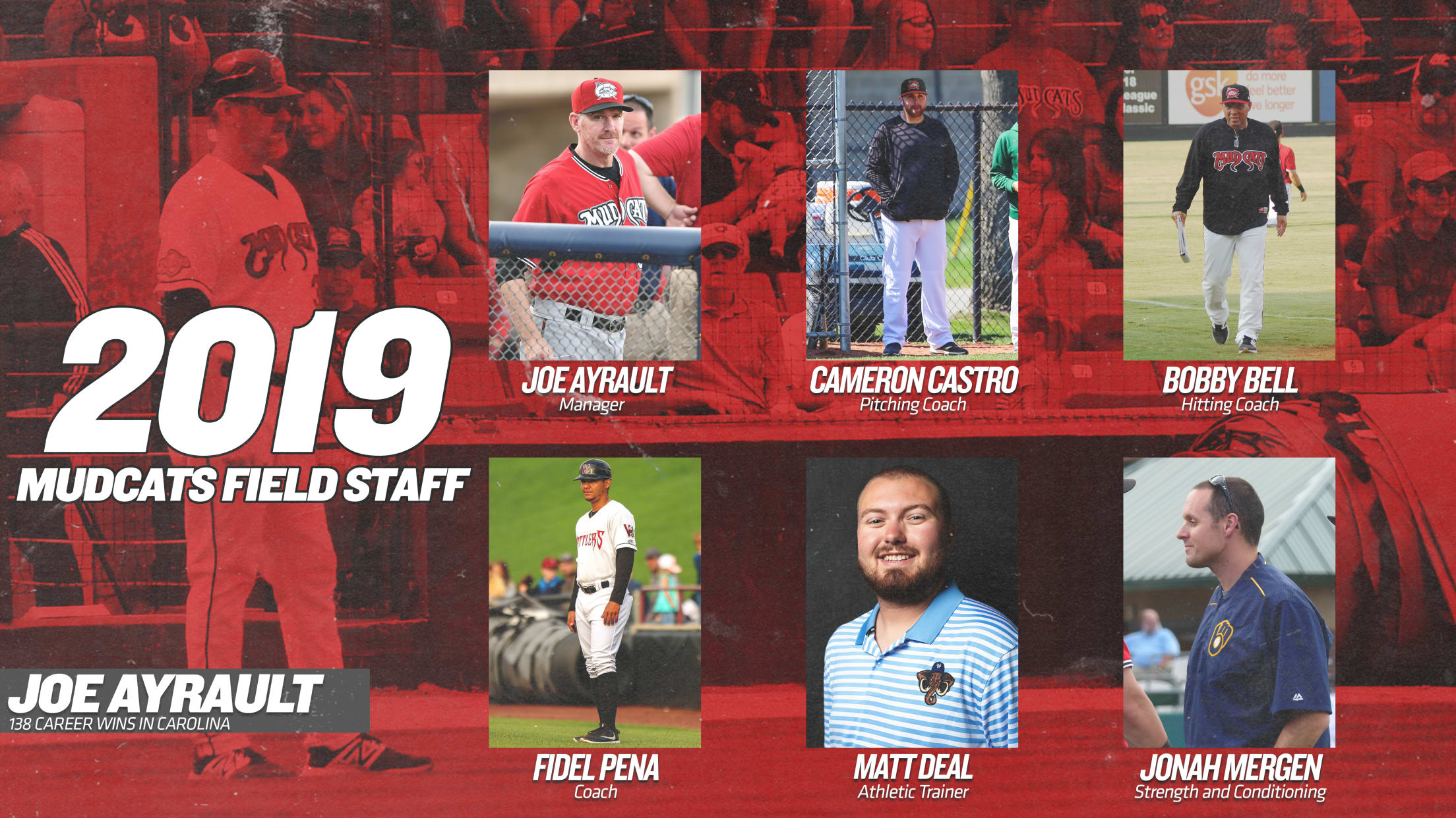 Ayrault, Bell and Mergen are all returnees to the Carolina staff; with Ayrault returning for his third straight with the Mudcats and eighth straight as manager of Milwaukee's Class-A Advanced affiliate. Bell is back for his second consecutive season with the Mudcats, and Mergen, like Ayrault, returns for his third in Carolina as well. Castro, Peña and Deal all enter their first seasons with Carolina; with Castro joining the Mudcats and Brewers organization for the first time.