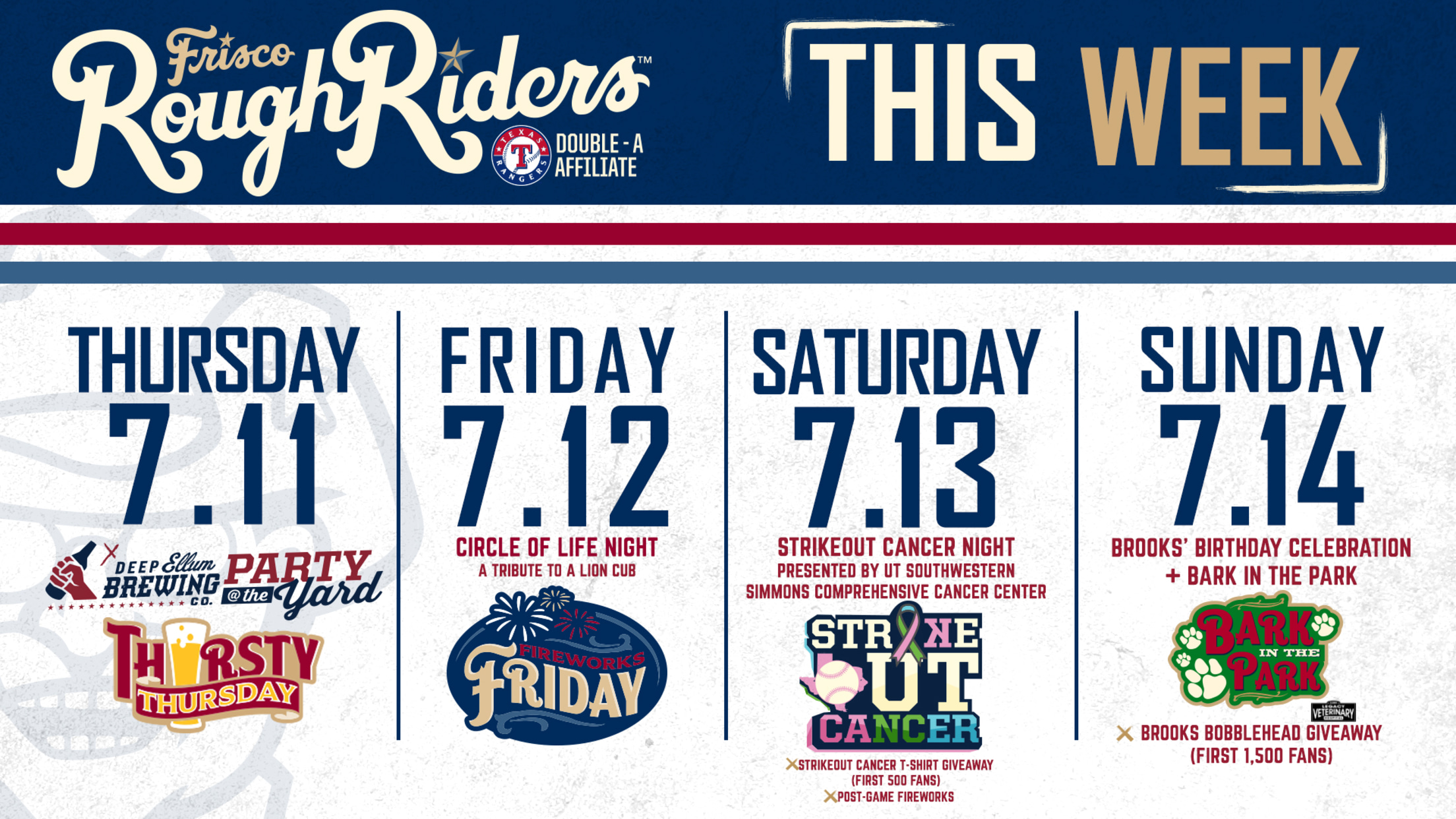 * Strikeout Cancer Night, presented by UT Southwestern Simmons Comprehensive Cancer Center: Cancer, you're out! The Riders dedicate the night to raising funds and awareness to combat cancer. The first 500 fans receive a Strikeout Cancer t-shirt.