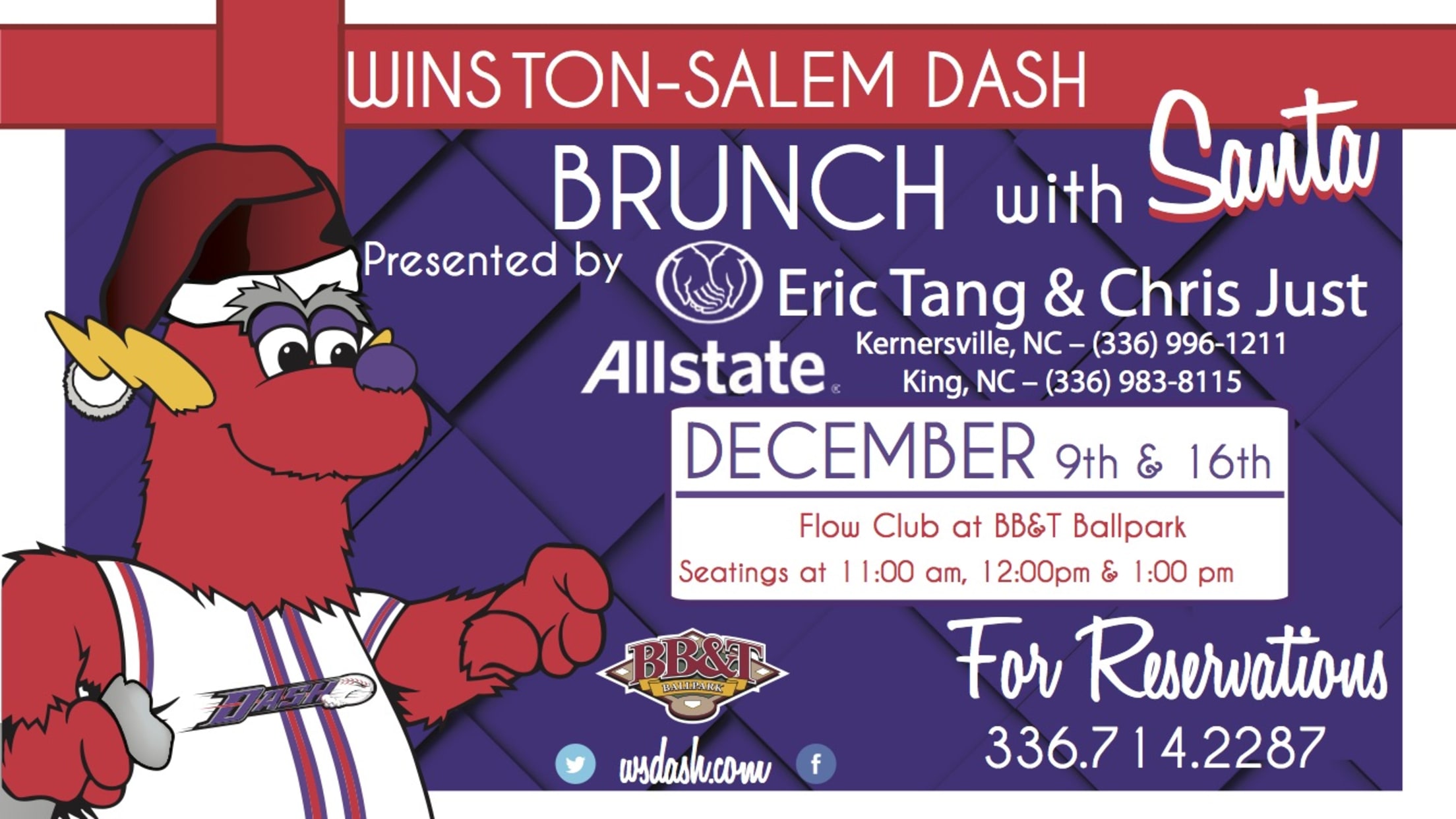 WINSTON-SALEM, N.C. (Nov. 20, 2018) - This holiday season, the Winston-Salem Dash will hold "Brunch with Santa", presented by Allstate agents Eric Tang and Chris Just on December 9 and December 16 with seatings at 11 a.m., 12 p.m. and 1 p.m. inside the Flow Club at BB&T Ballpark.