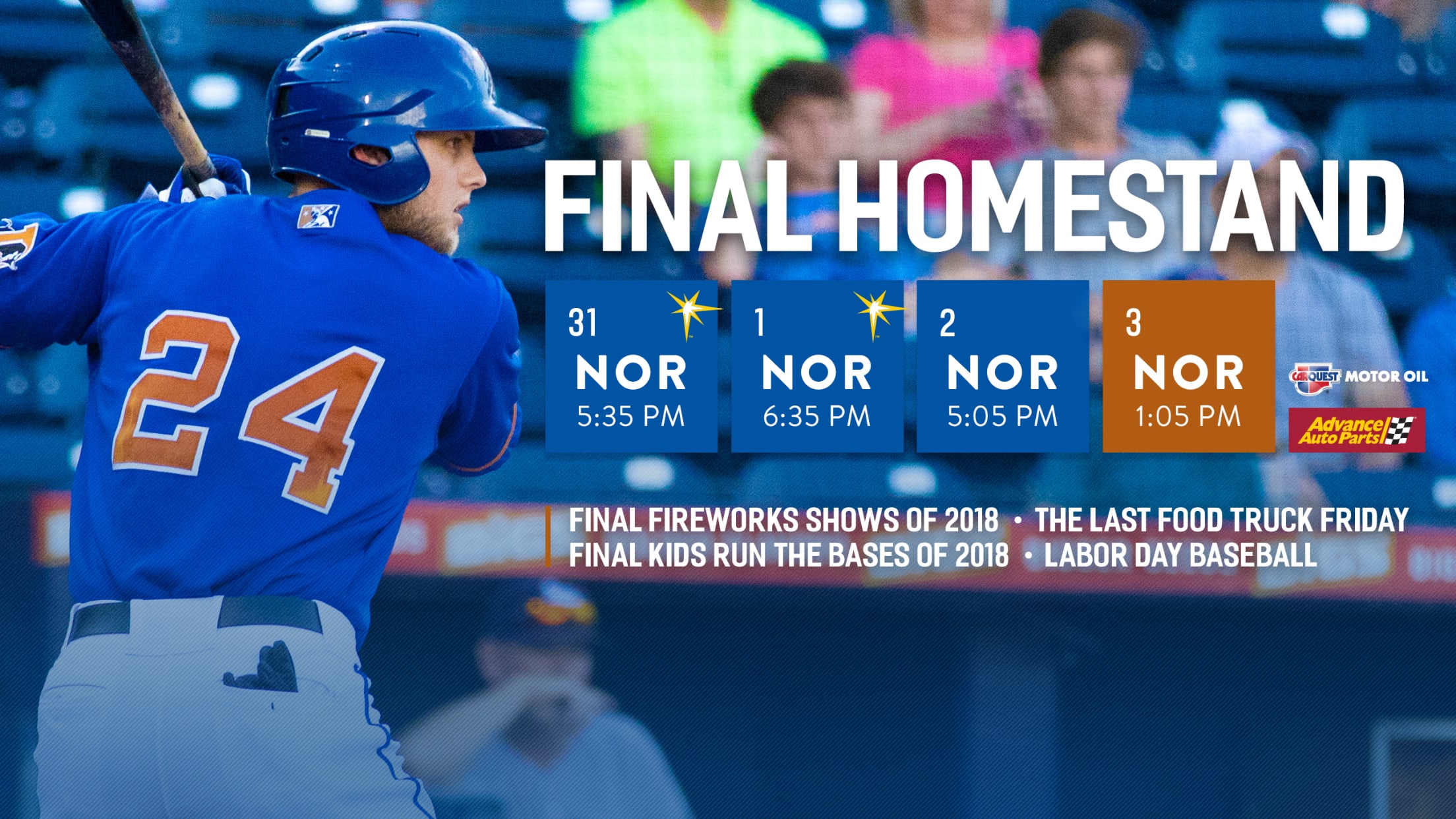 The Durham Bulls will close out their 2018 regular season with a four-day series against the Norfolk Tides beginning Aug. 31. A pair of fireworks shows, Kids Run the Bases and a 1:05 p.m. start on Labor Day highlight the promotional schedule.Durham opens its final homestand of the season at