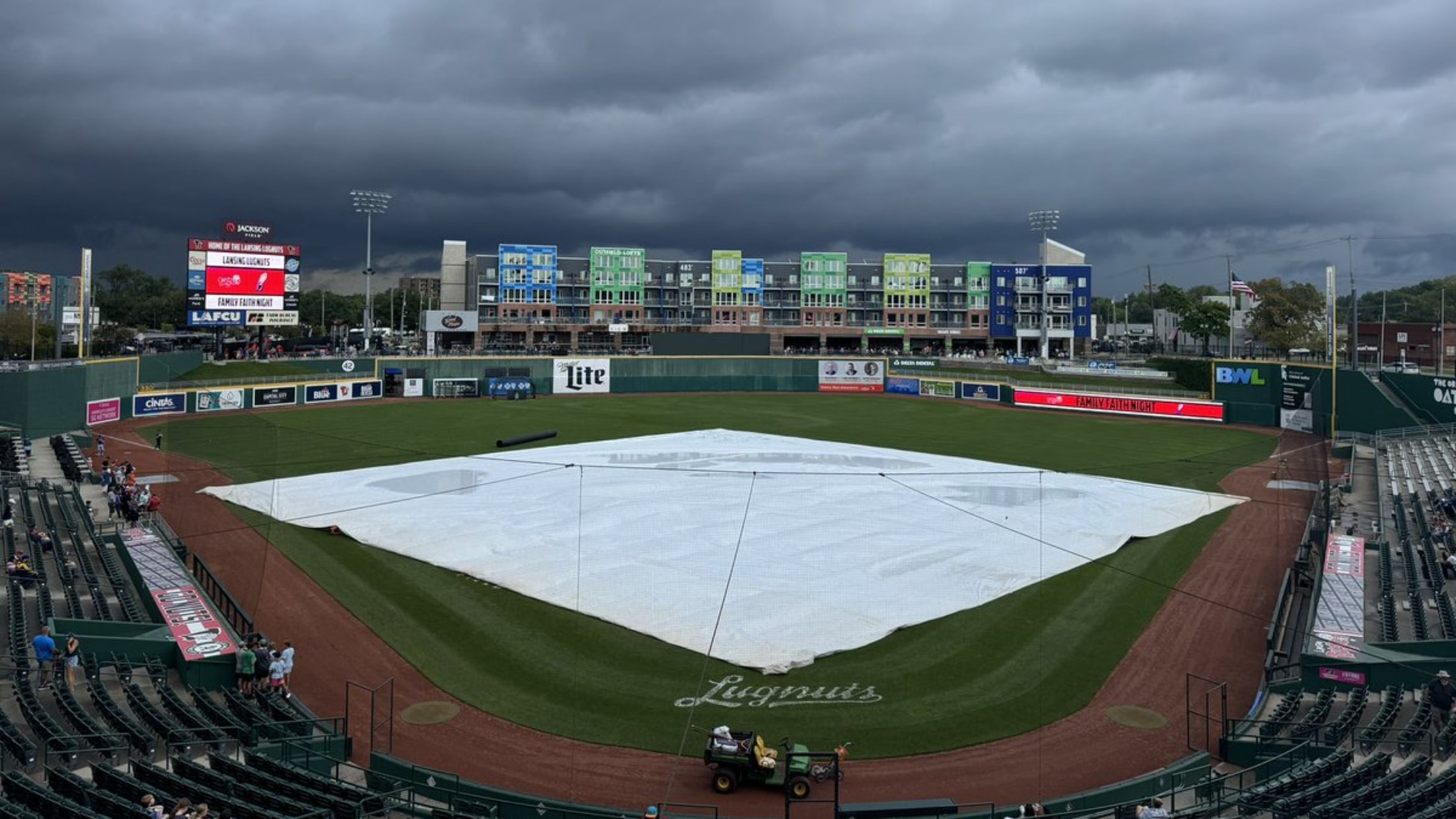 LANSING, MI – The fifth game of the West Michigan Whitecaps six-game series against the Lansing Lugnuts was postponed after a pregame thunderstorm made field conditions unplayable Saturday night at Jackson Field. Heavy rains moved through Lansing roughly 30 minutes before the first pitch, leaving much of the outfield with