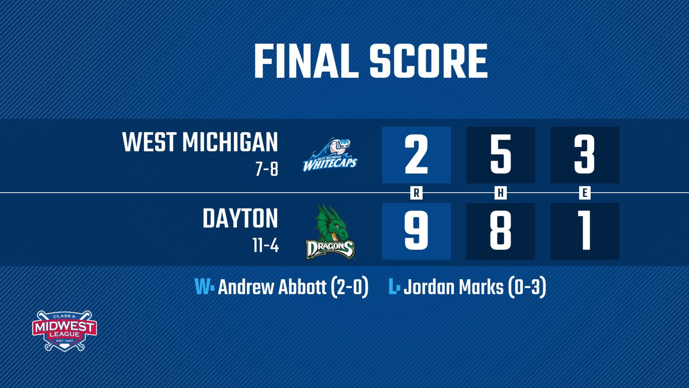 The Whitecaps record drops to 7-8, while the Dragons improve to 11-4. Dayton pitcher Andrew Abbott (2-0) dominated, tossing the final six innings and allowing just one run on three hits while striking out a career-high 11 batters to collect his second win of the season, while Marks (0-3) suffered his third loss of 2022. Perez reached base three times in a losing cause. The loss gives Dayton wins in five of the six games in this weeklong series.